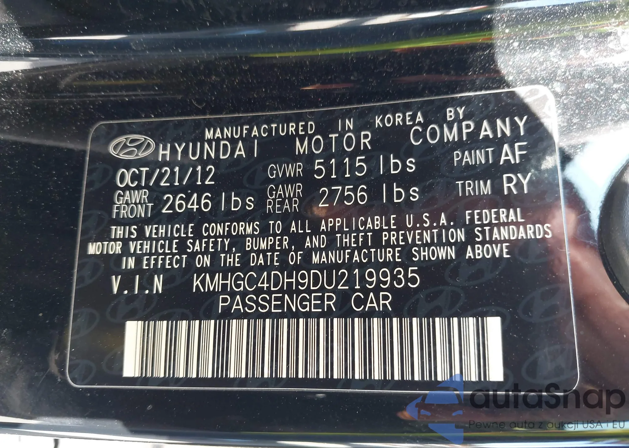 LOT: 44292064 VIN: KMHGC4DH9DU219935