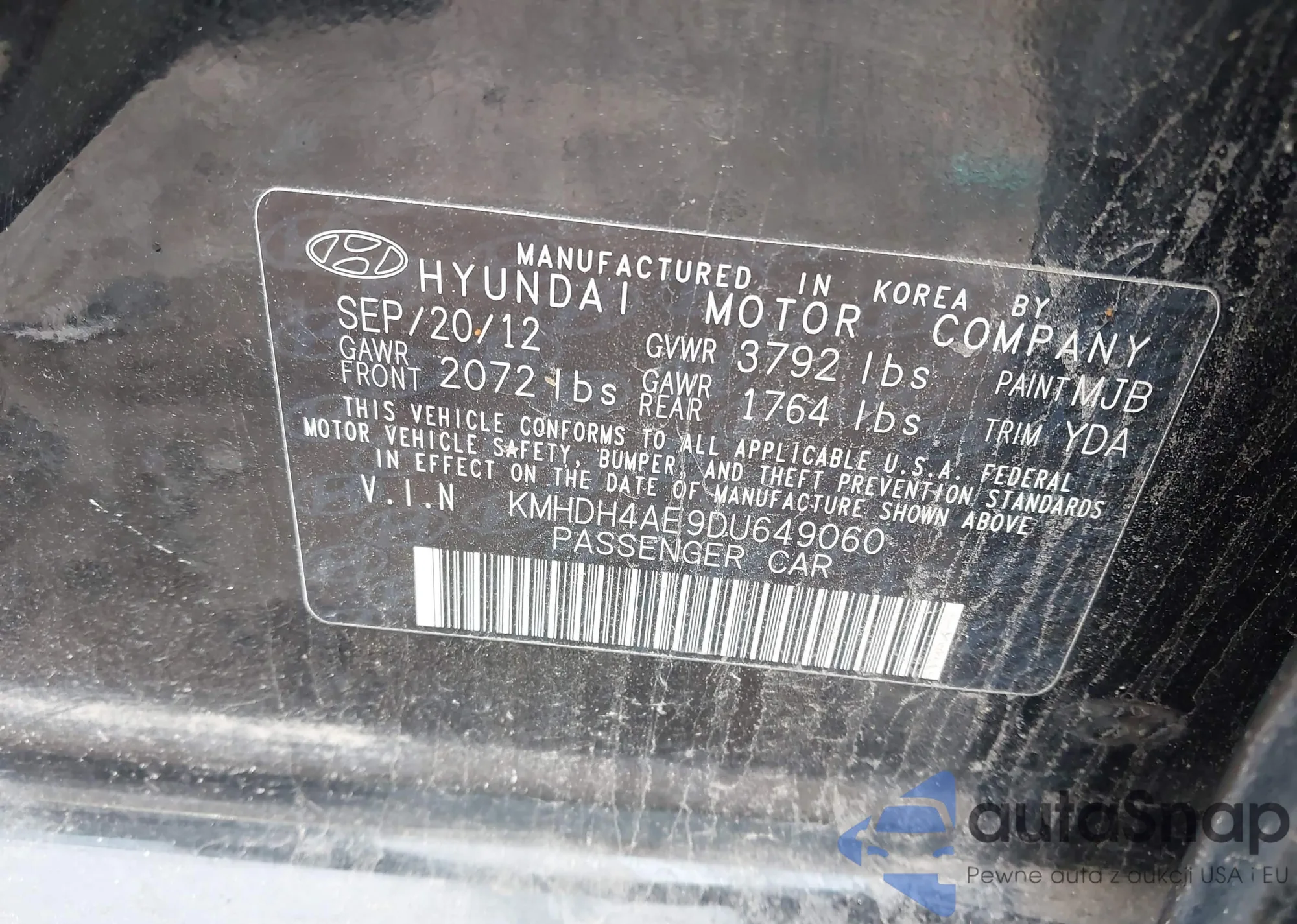 LOT: 44061253 VIN: KMHDH4AE9DU649060