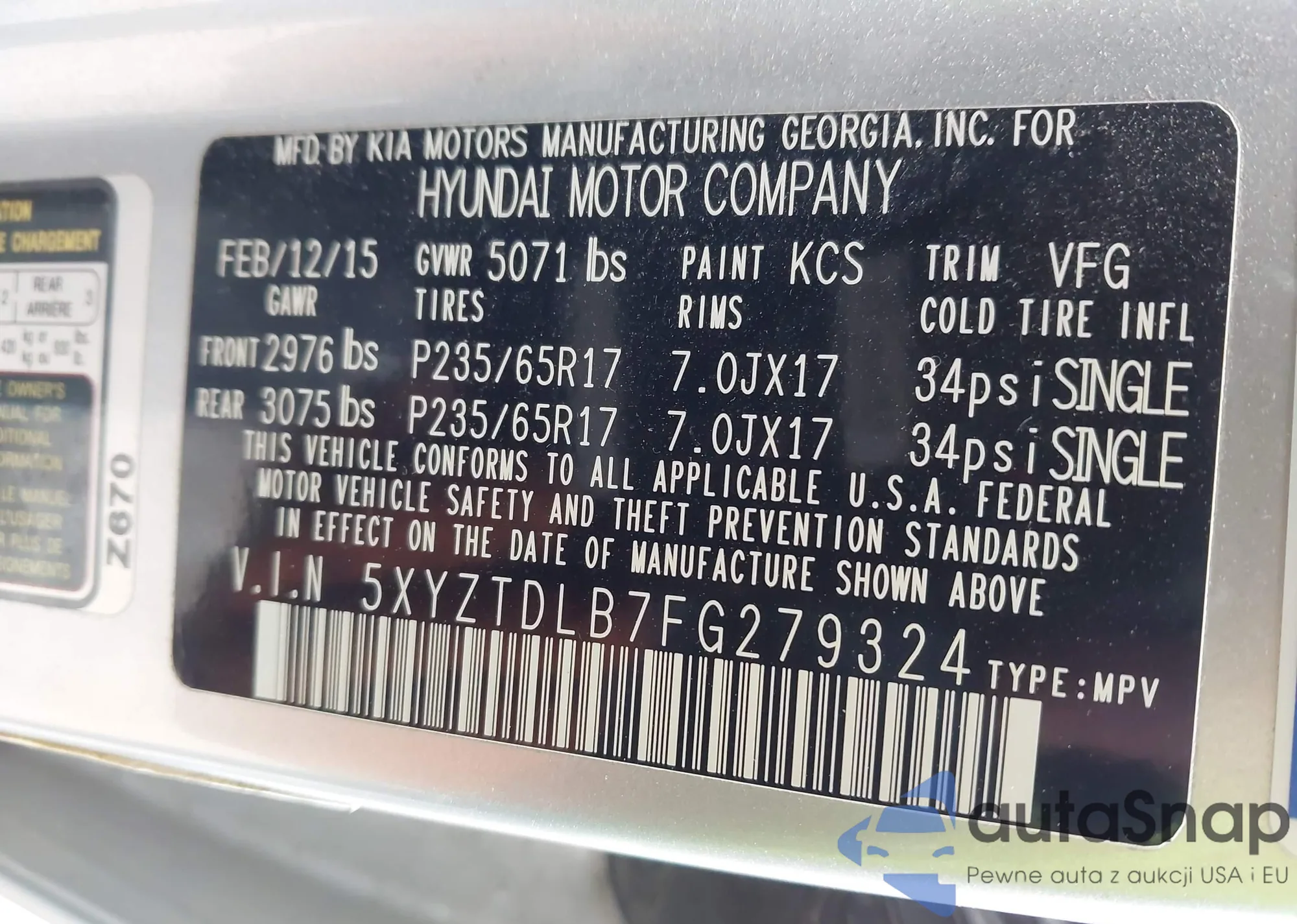 • VIN 5XYZTDLB7FG279324