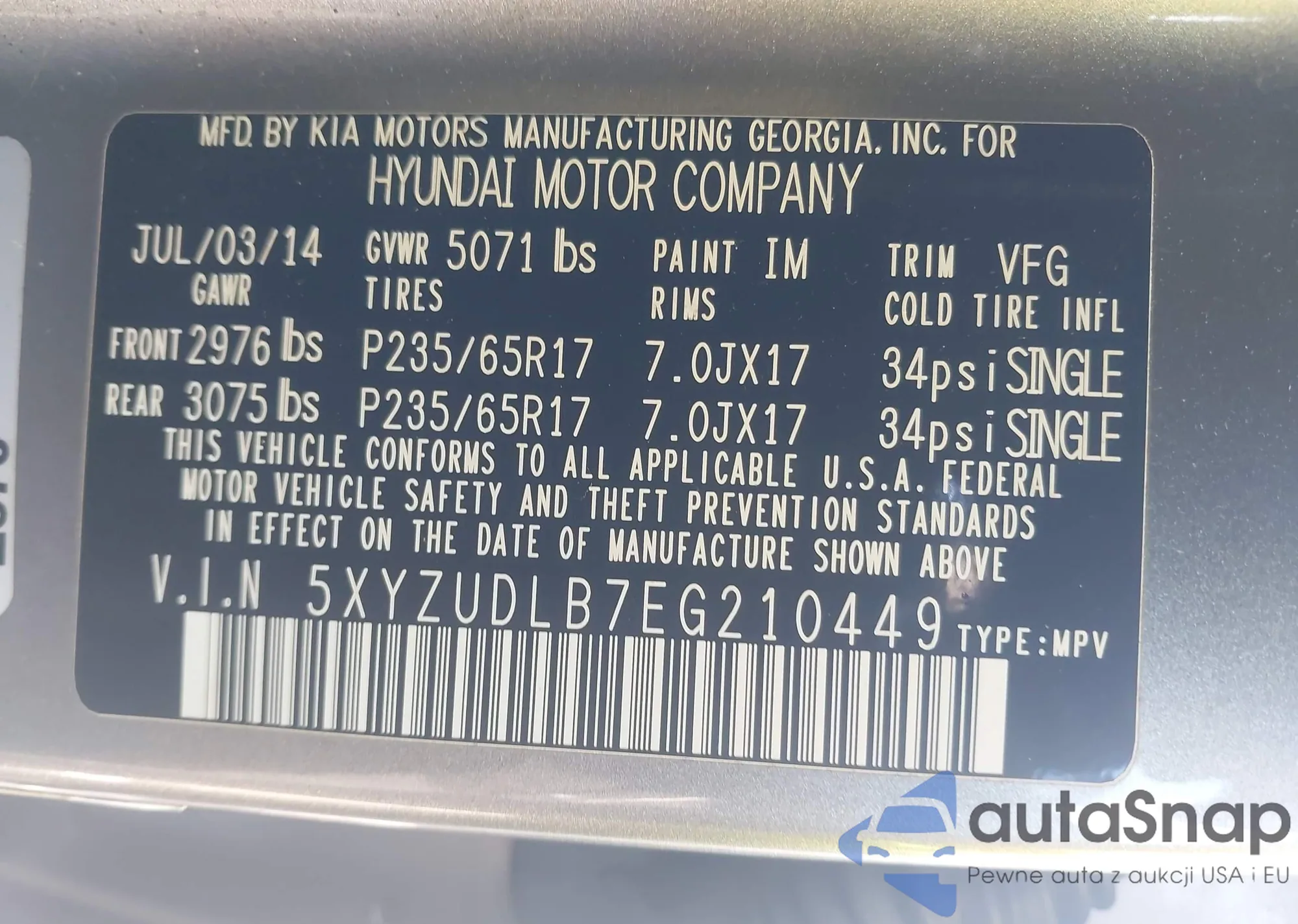 • VIN 5XYZUDLB7EG210449