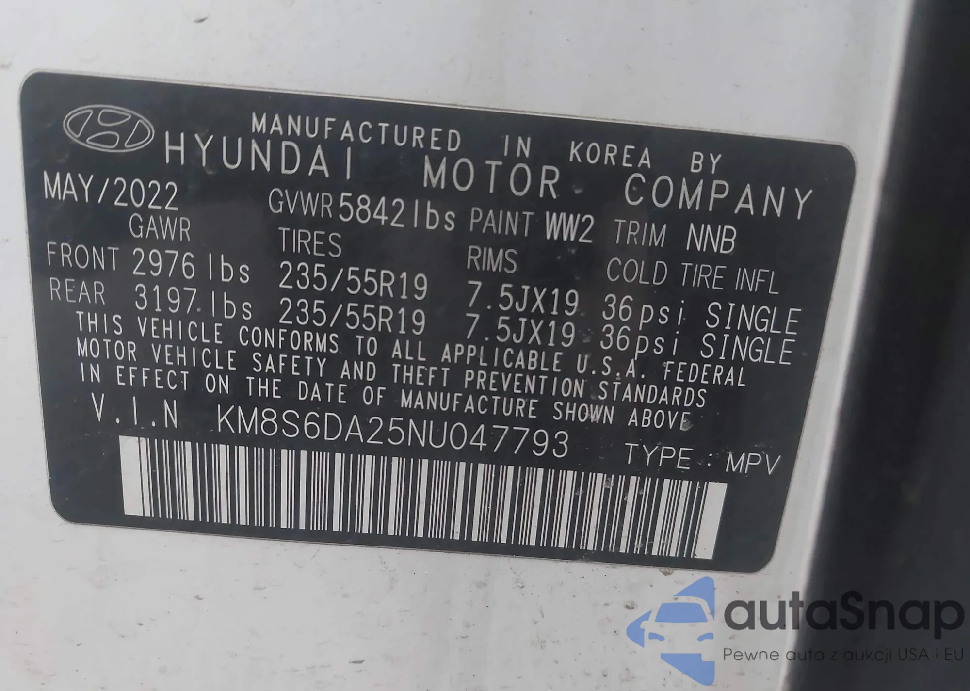 LOT: 44463146 VIN: KM8S6DA25NU047793