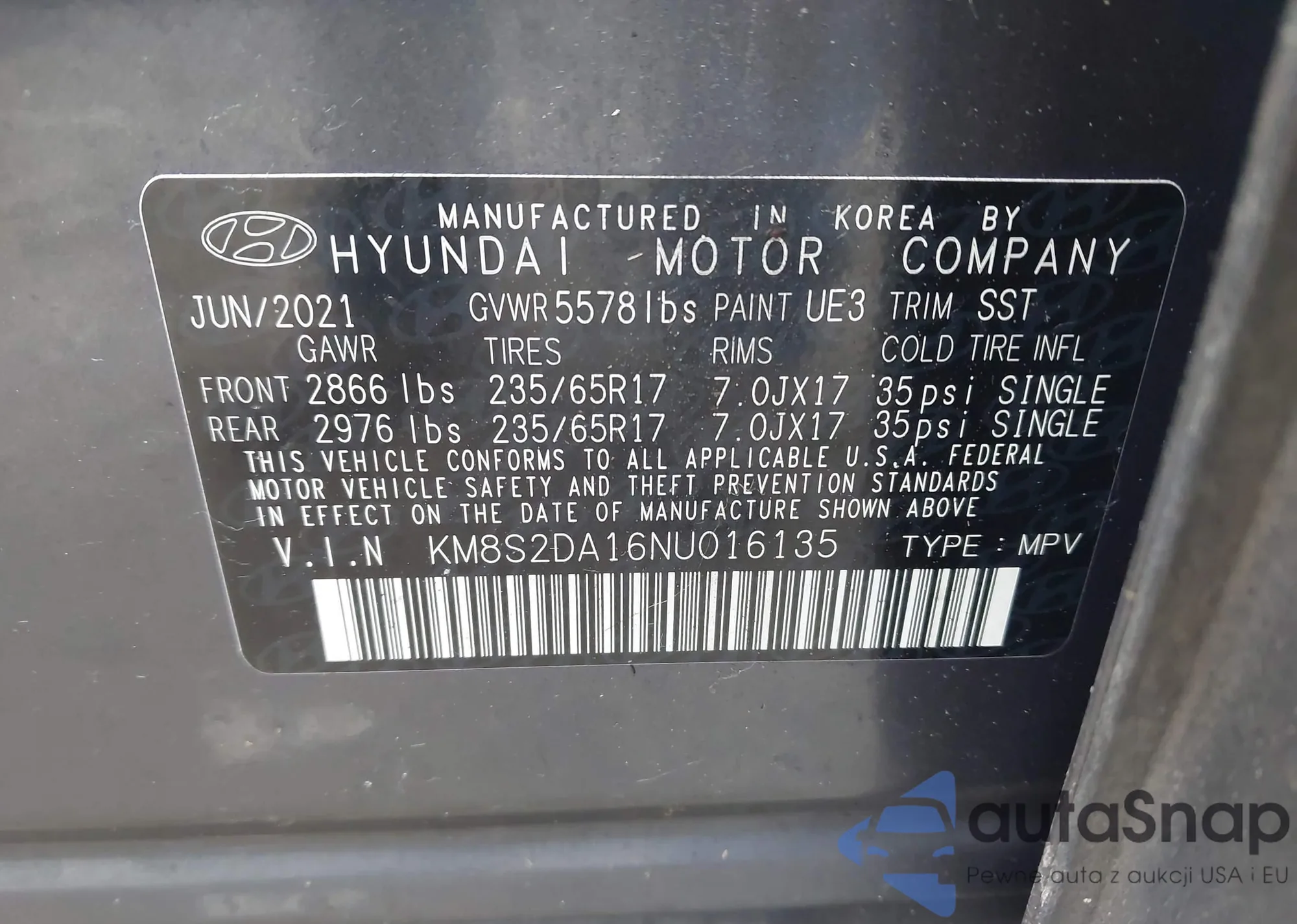 LOT: 44538867 VIN: KM8S2DA16NU016135