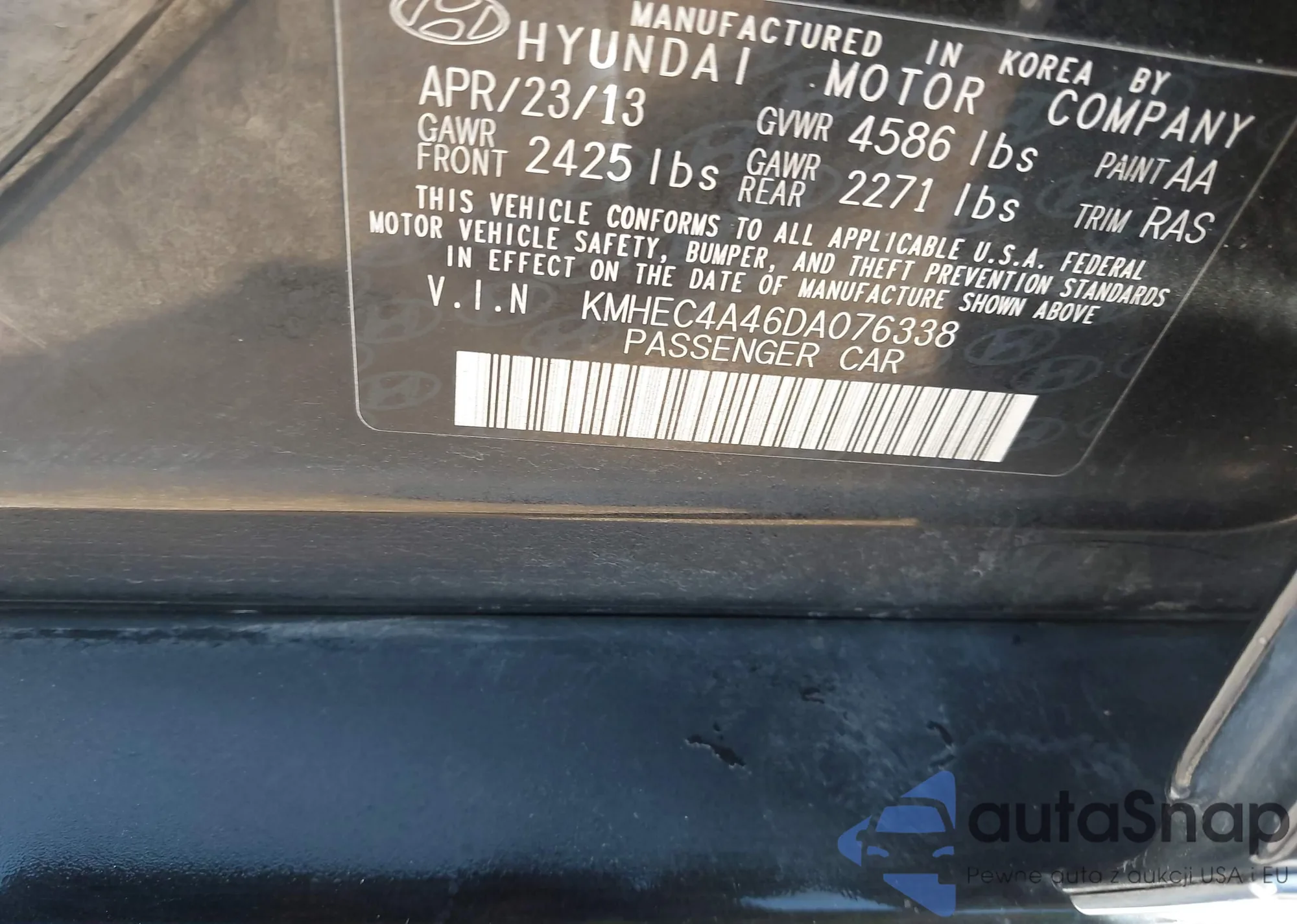 LOT: 44164167 VIN: KMHEC4A46DA076338