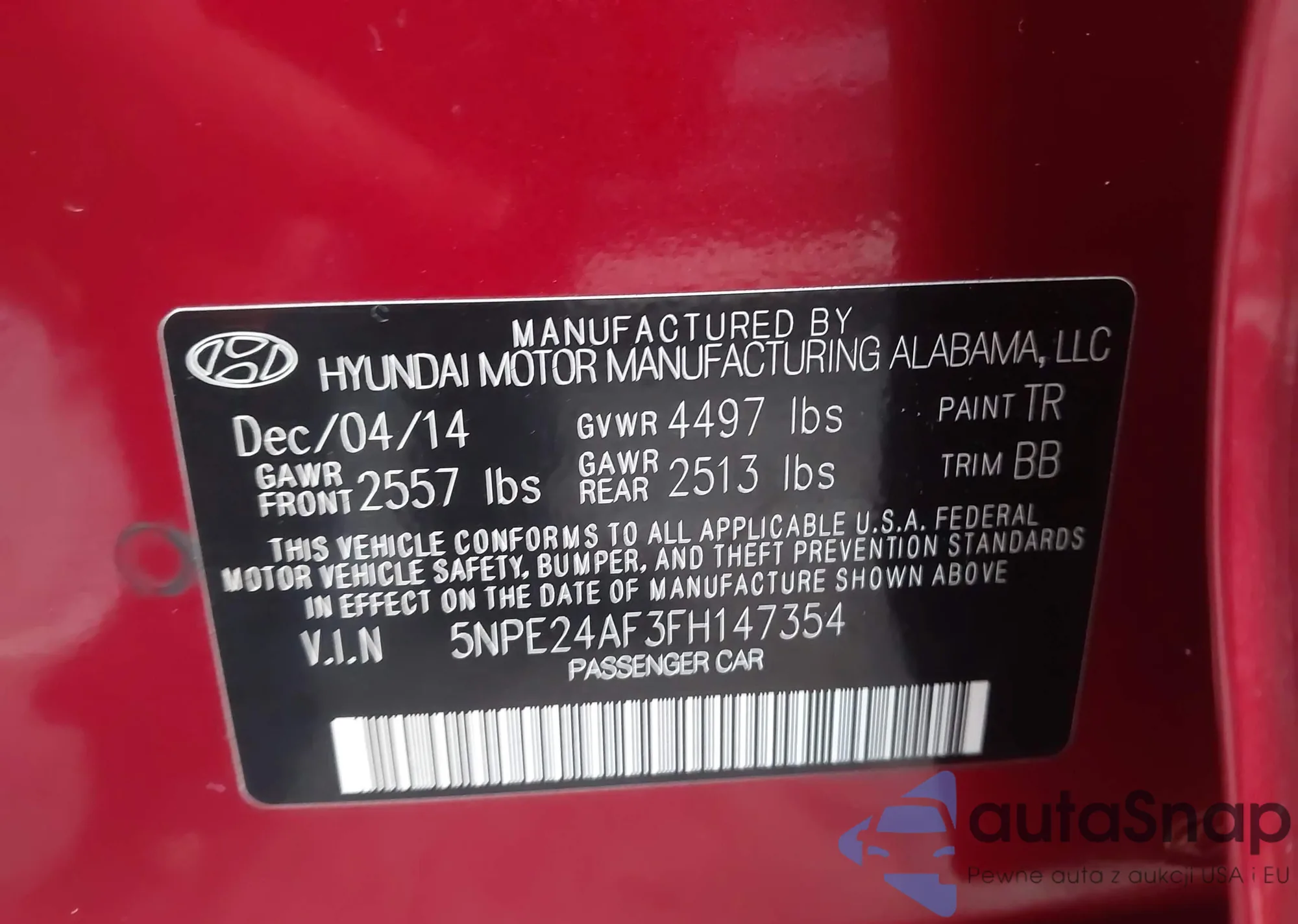 • VIN 5NPE24AF3FH147354