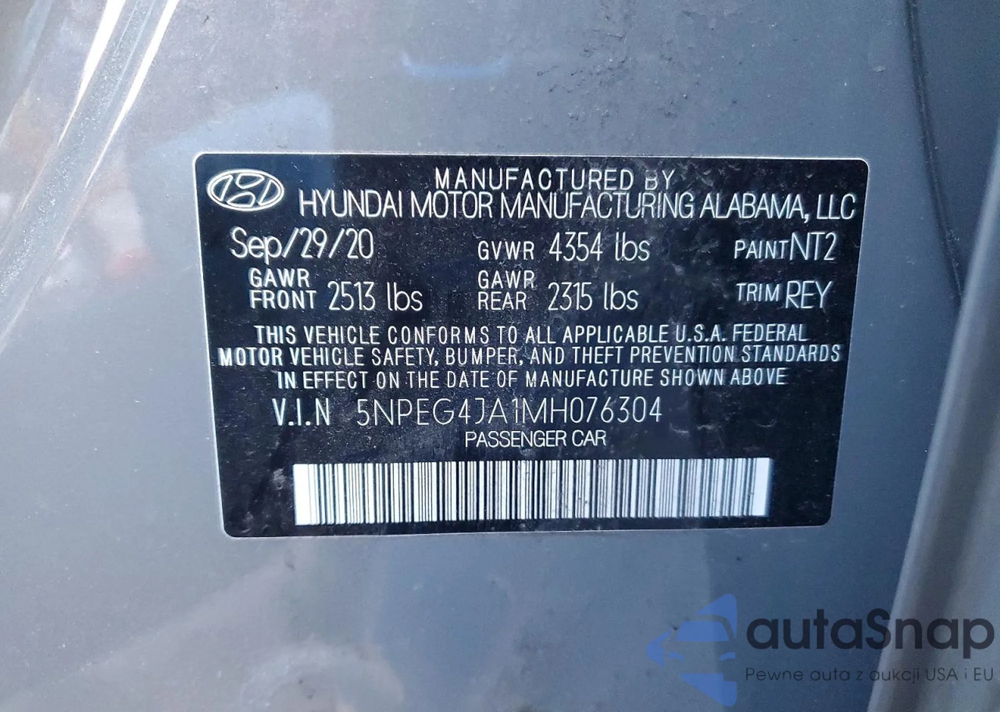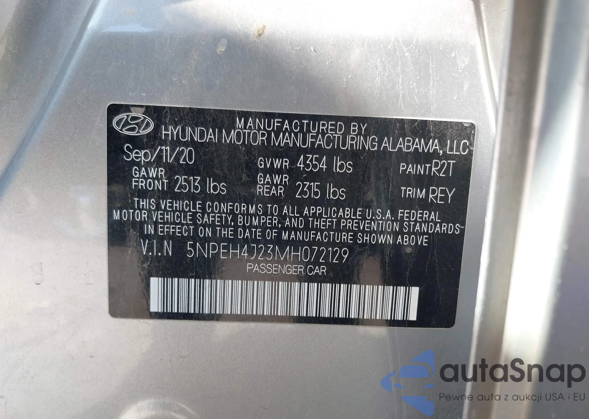 LOT: 43895009 VIN: 5NPEH4J21MH125930