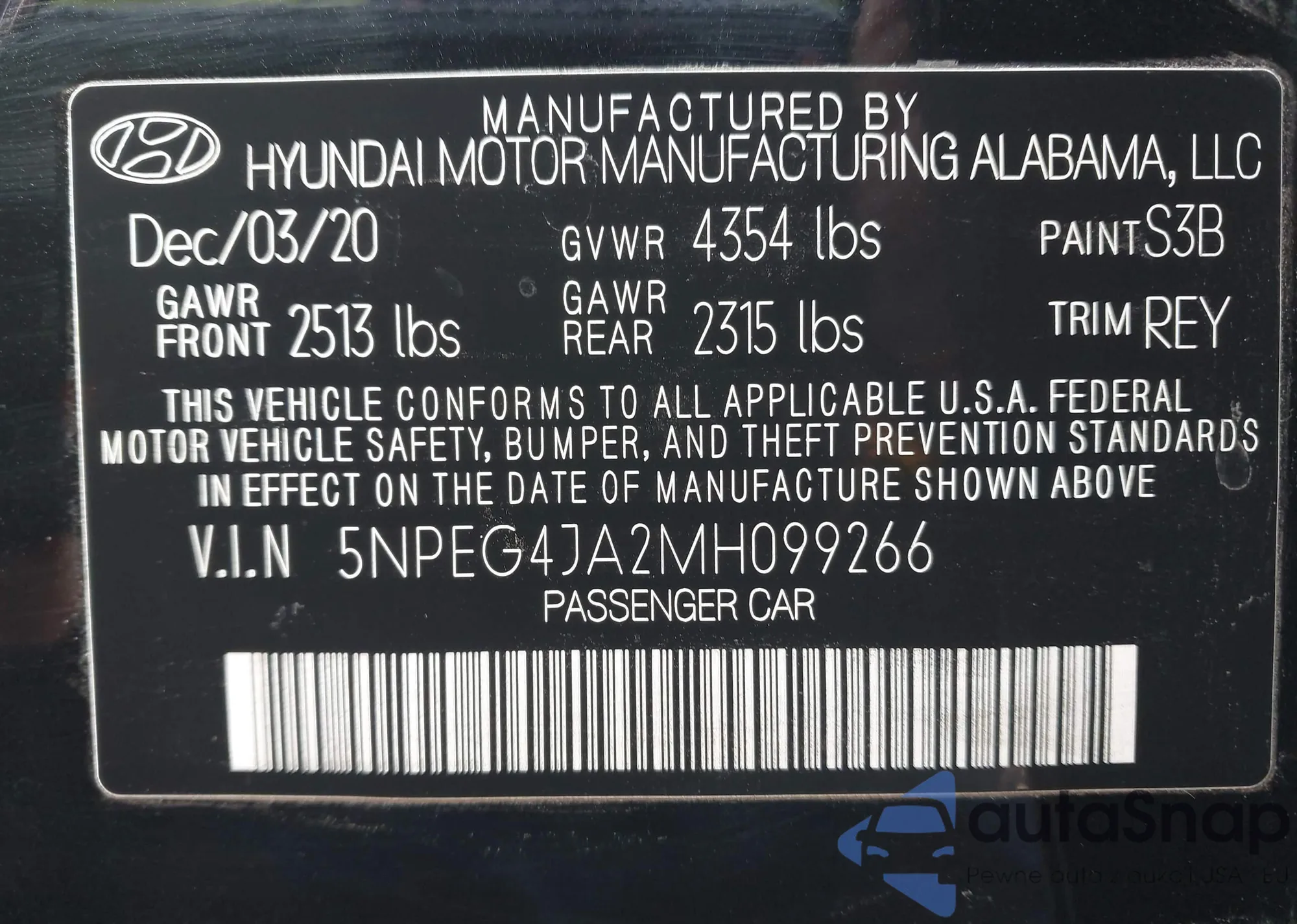 LOT: 44121154 VIN: 5NPEH4J22LH026077