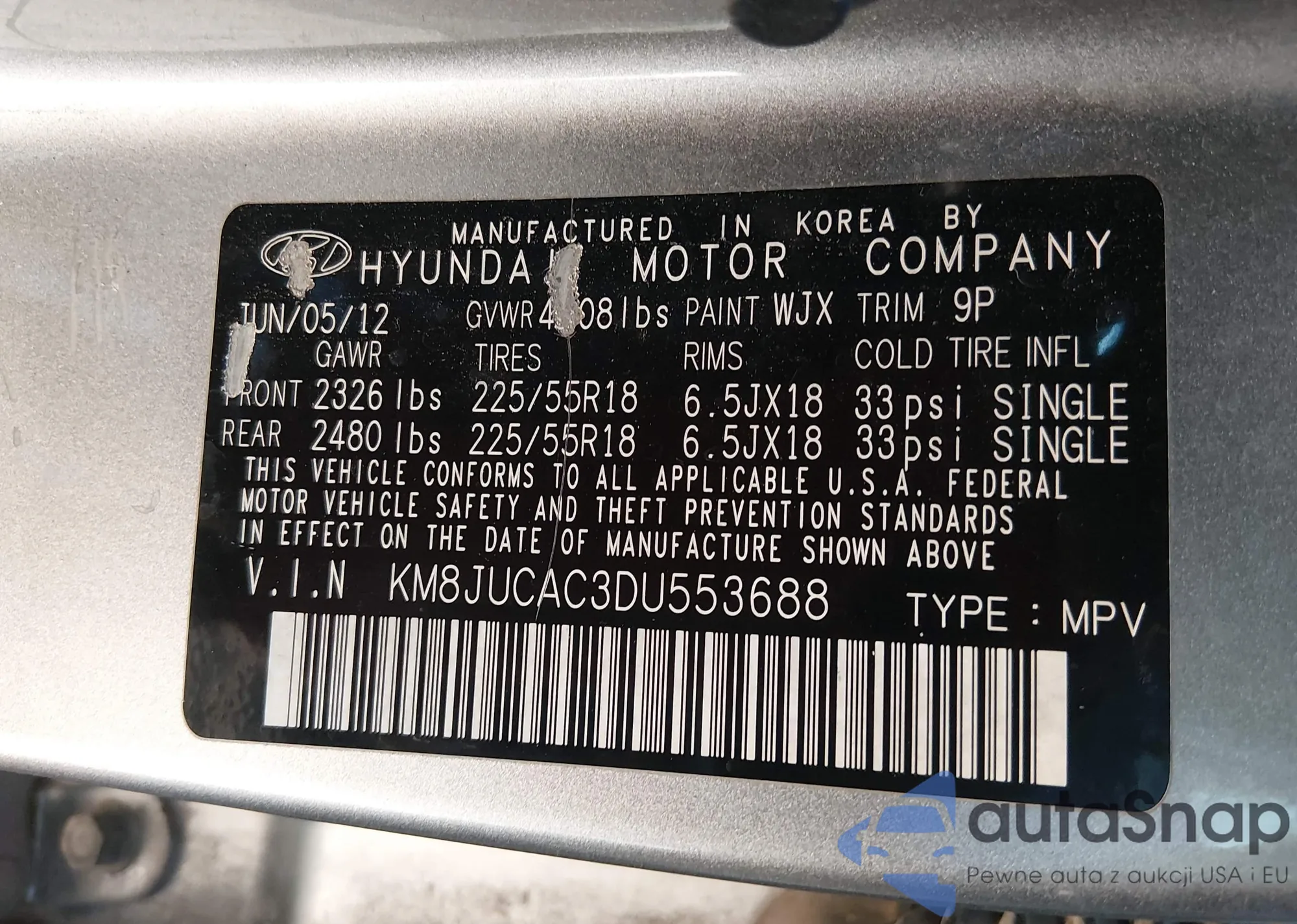 • VIN KM8JUCAC3DU553688