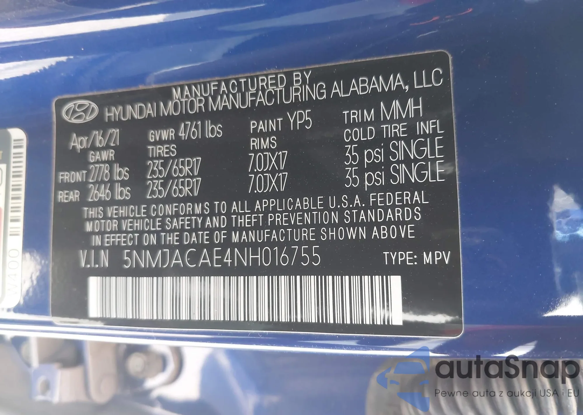 • VIN 5NMJACAE4NH016755