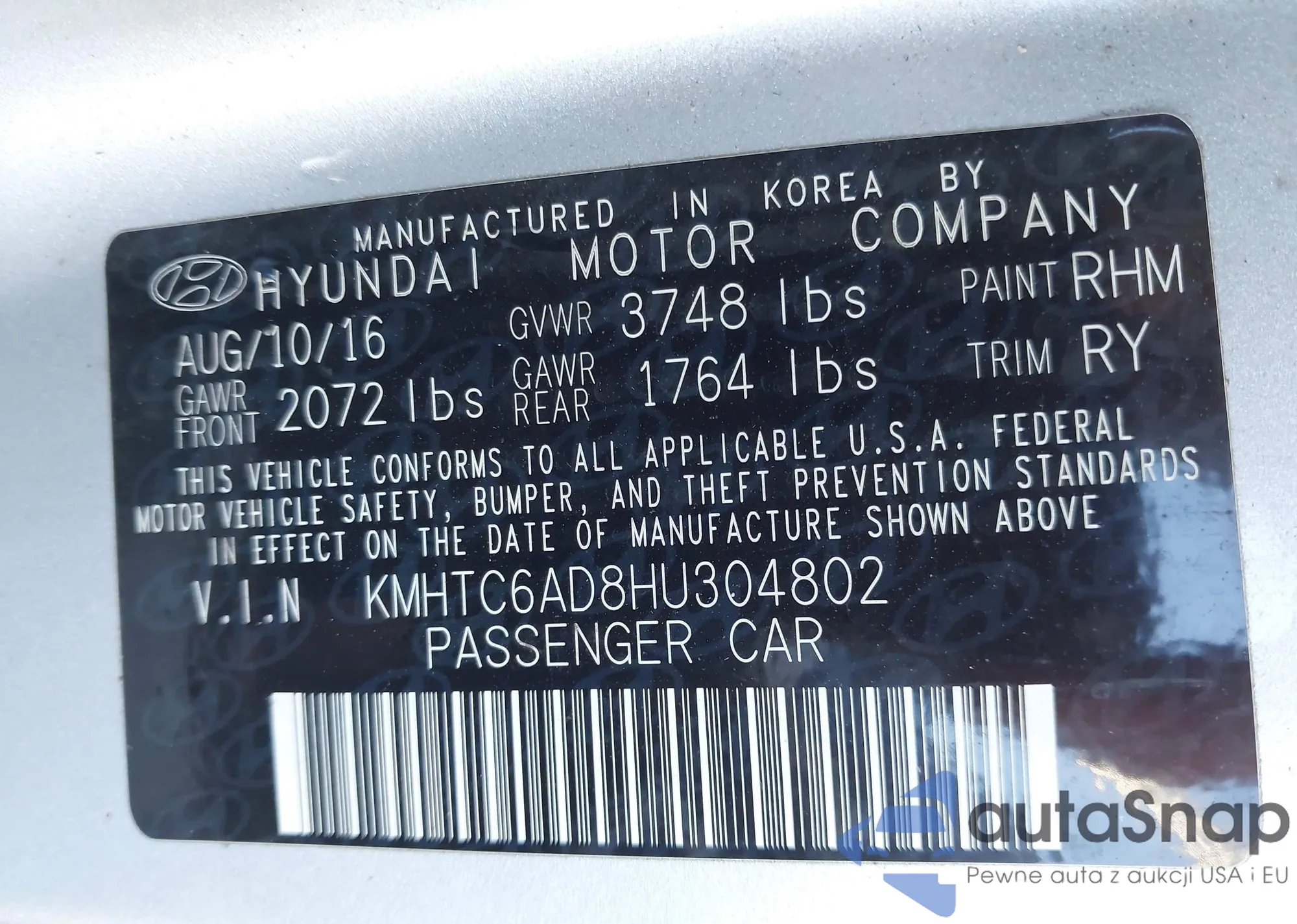 • VIN KMHTC6AD8HU304802