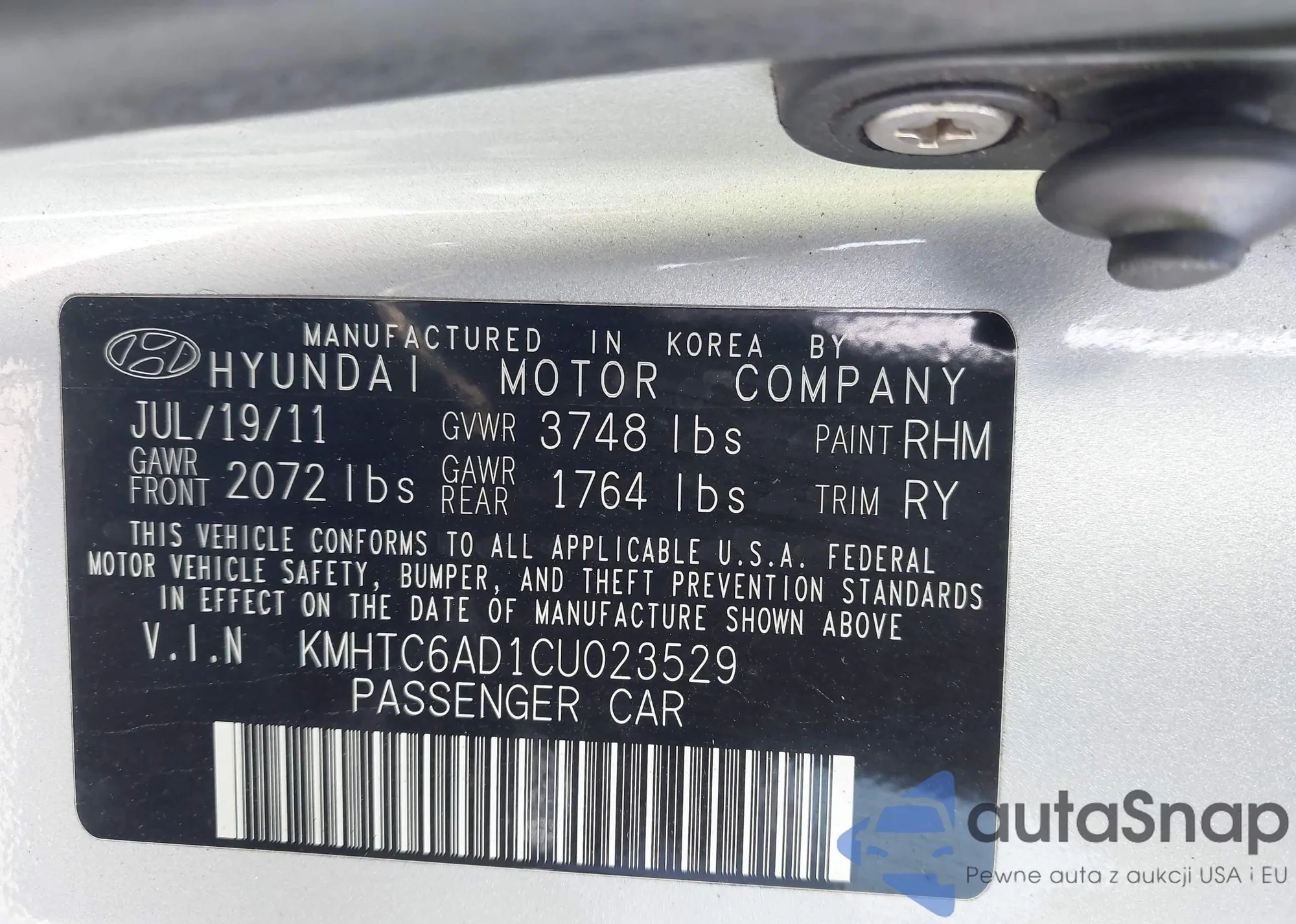 • VIN KMHTC6AD1CU023529