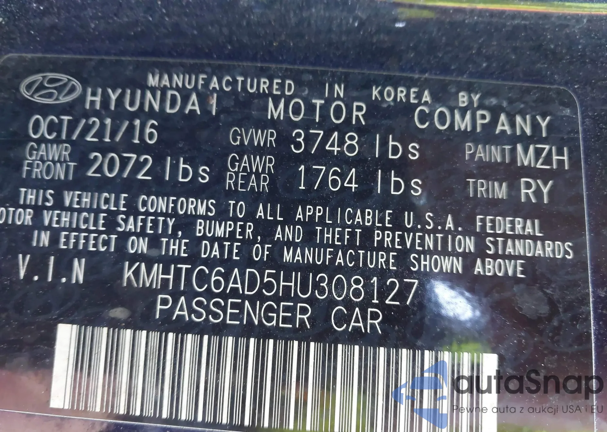 • VIN KMHTC6AD5HU308127
