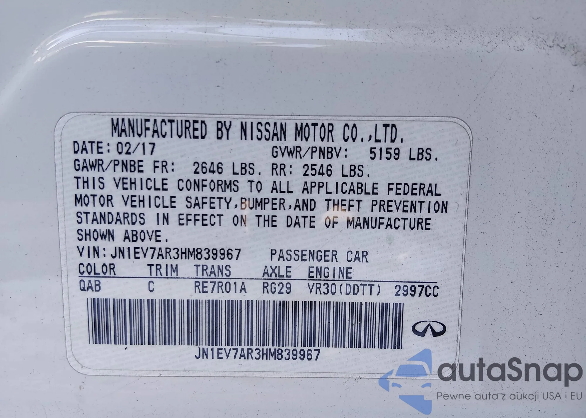 LOT: 44190357 VIN: JN1EV7AR3HM839967