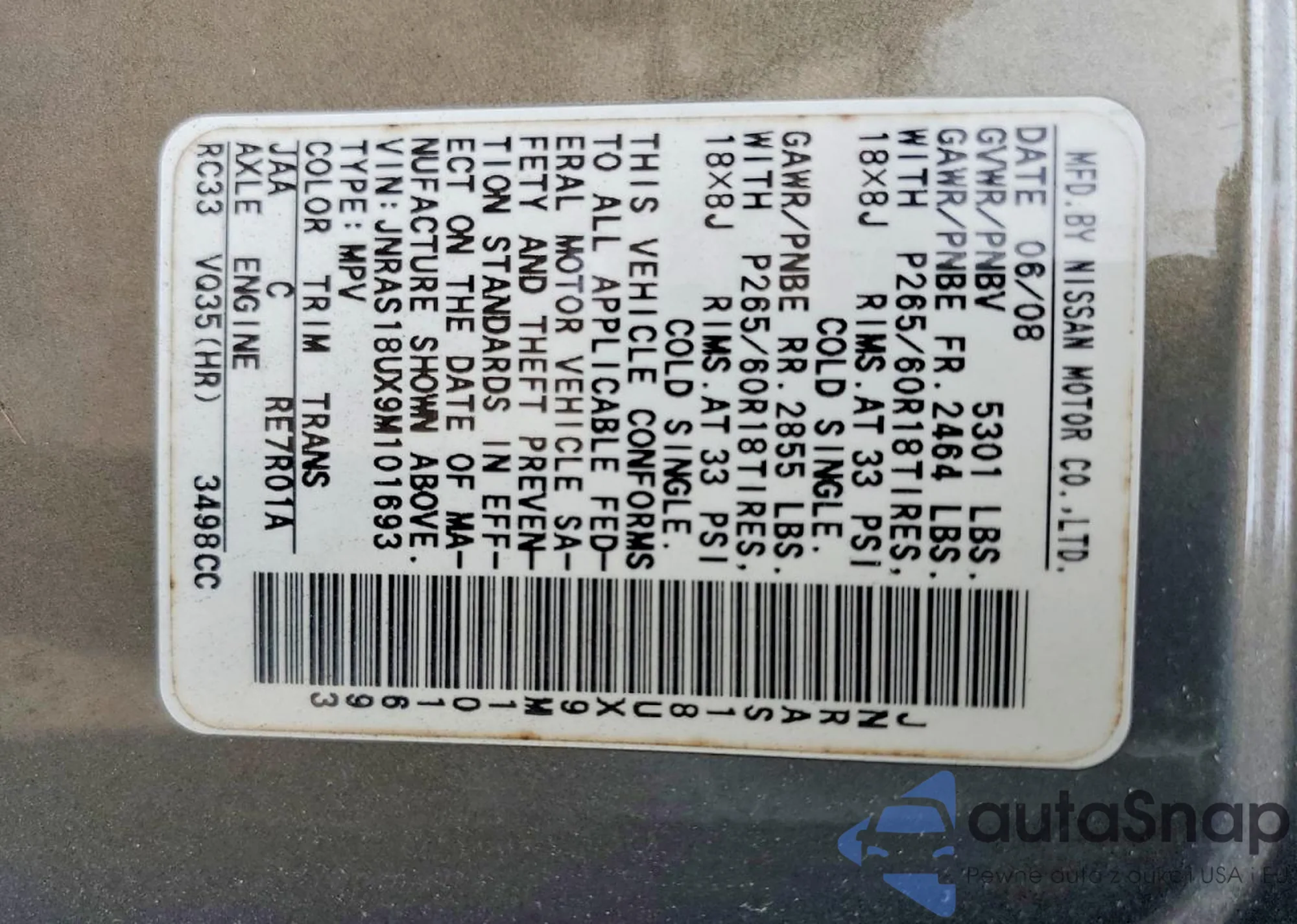 LOT: 74012345 VIN: JNRAS18UX9M101693