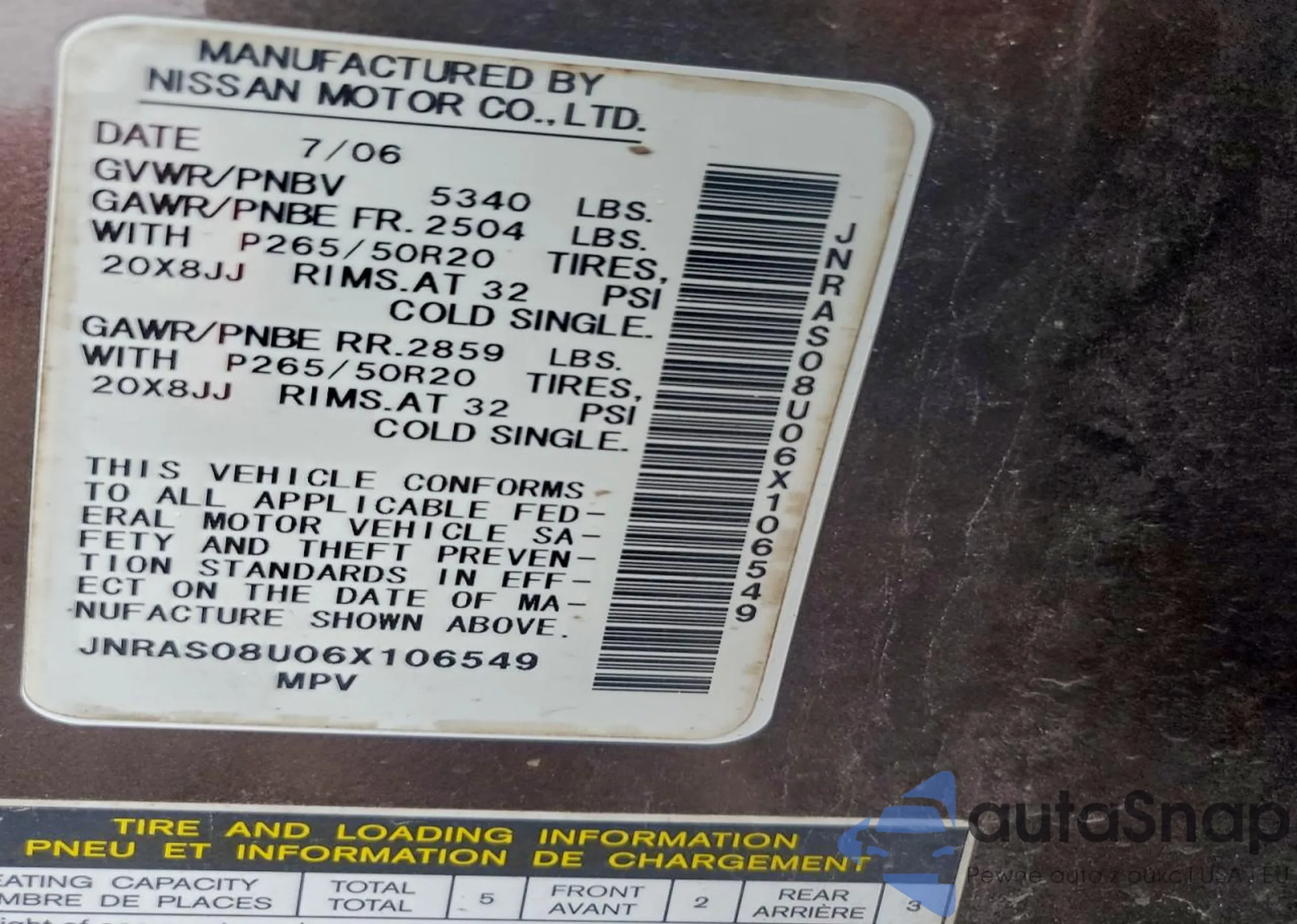 LOT: 96933645 VIN: JNRAS08U06X106549