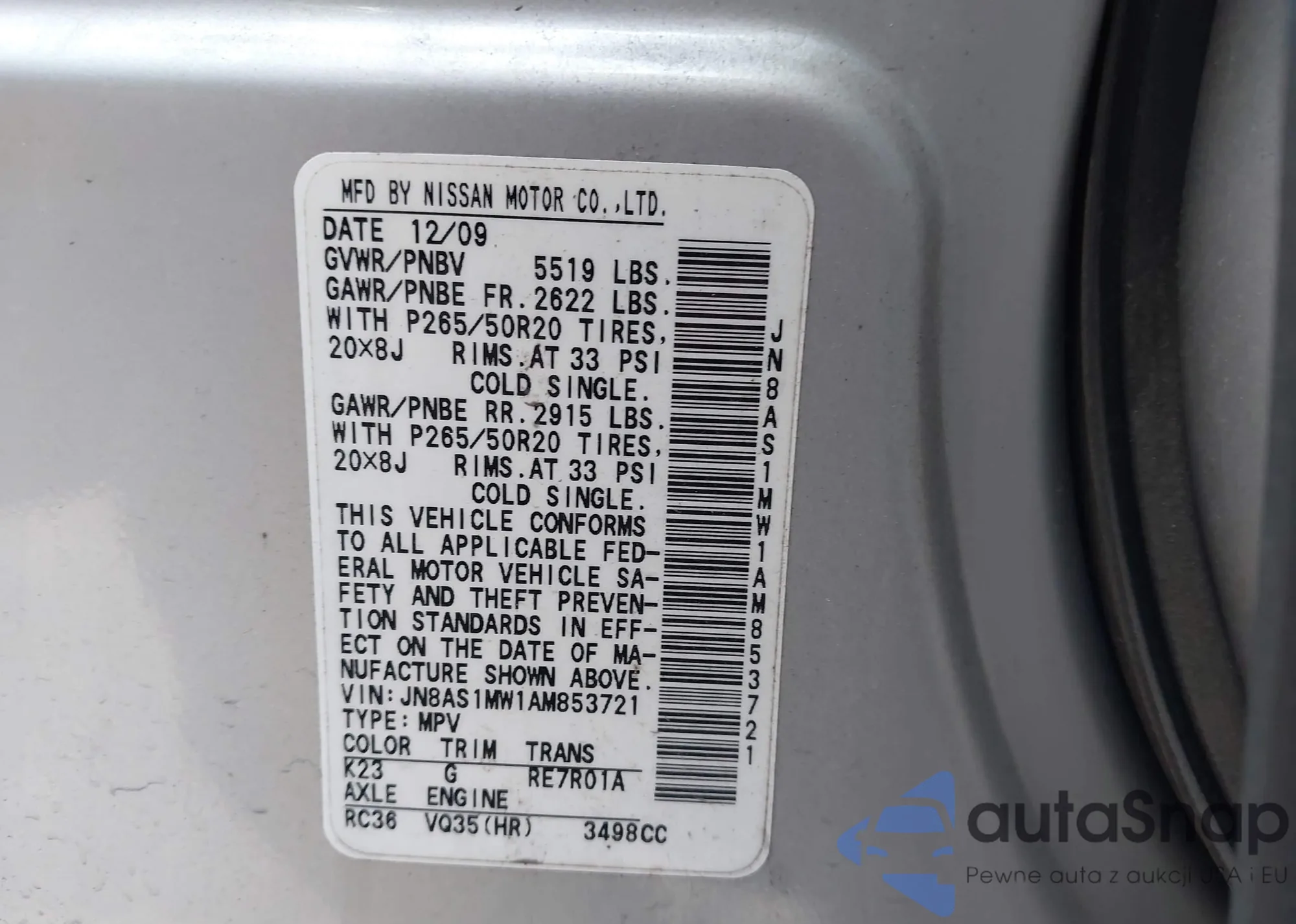 • VIN JN8AS1MW7AM853870