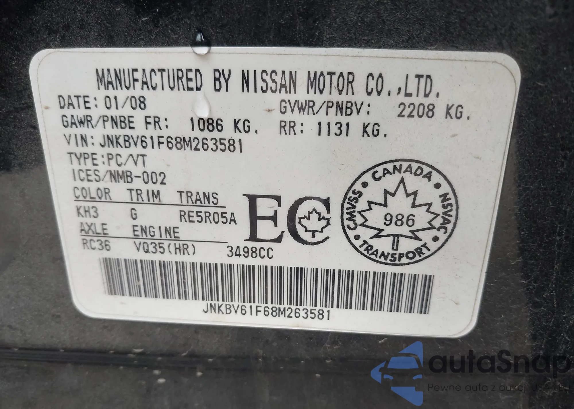 LOT: 40492897 VIN: JNKBV61F68M263581