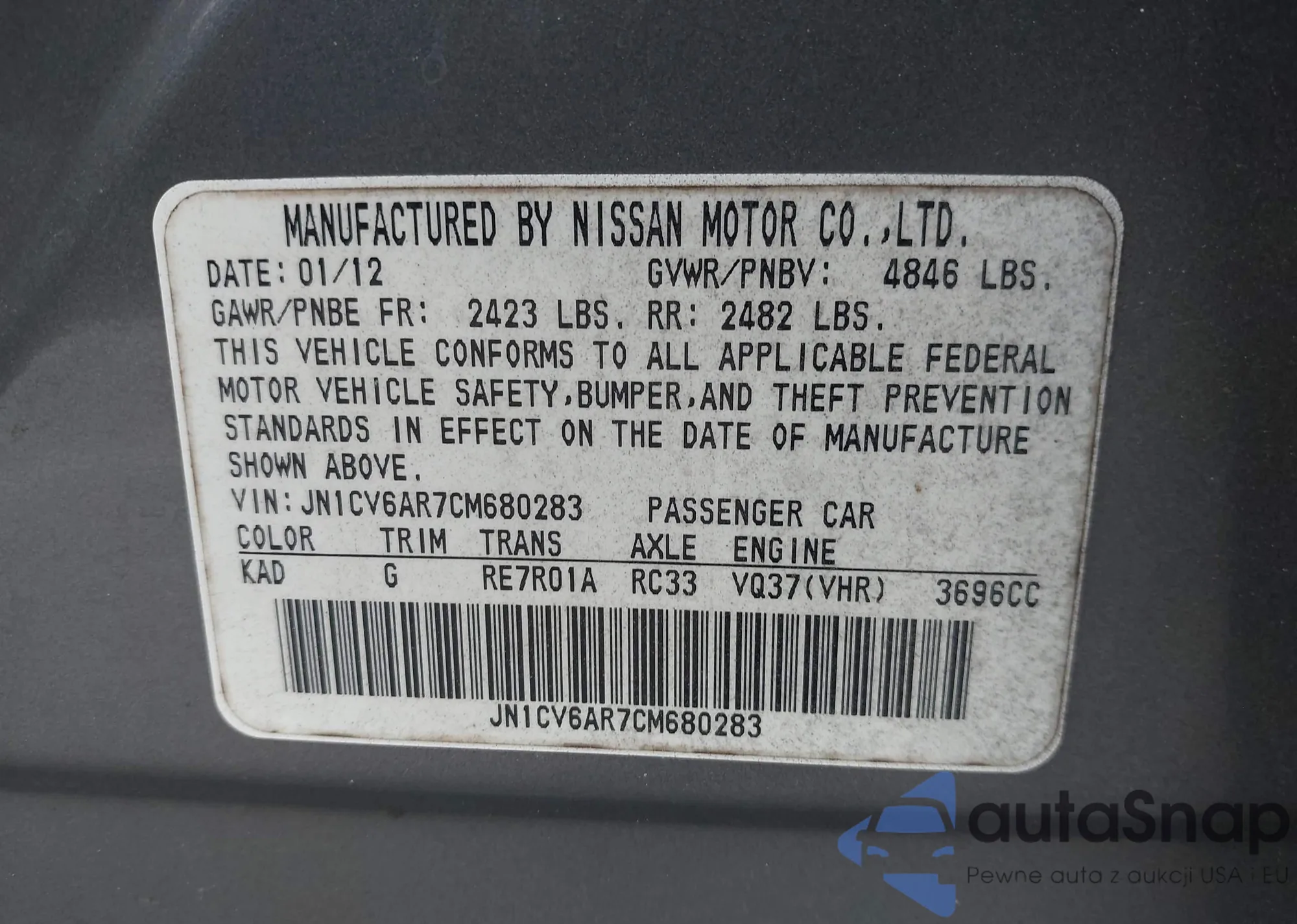 LOT: 43182506 VIN: JN1CV6AR7CM680283