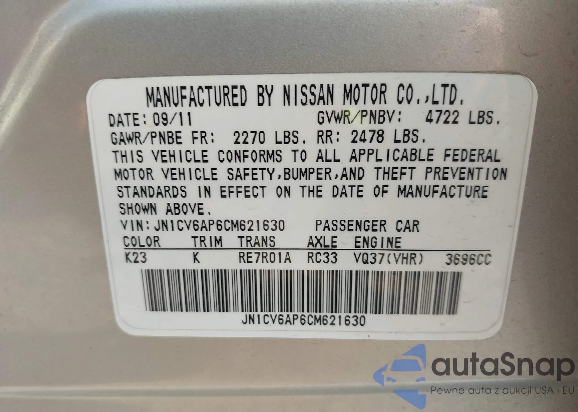 LOT: 43361440 VIN: JN1CV6AP6CM621630