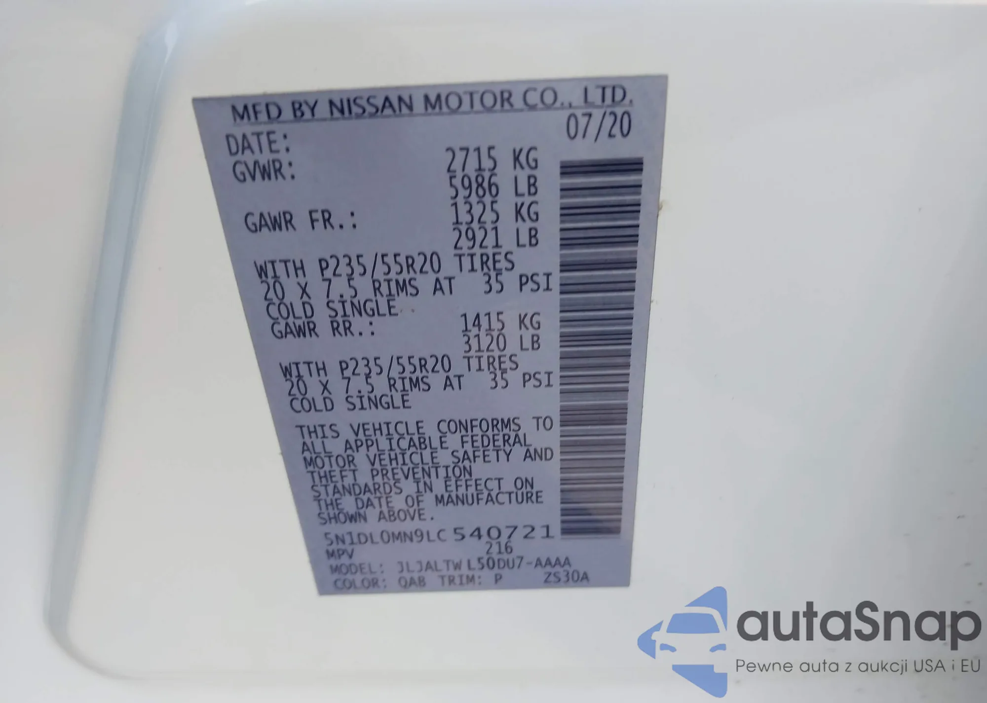 LOT: 40720102 VIN: 5N1DL0MN9LC540721