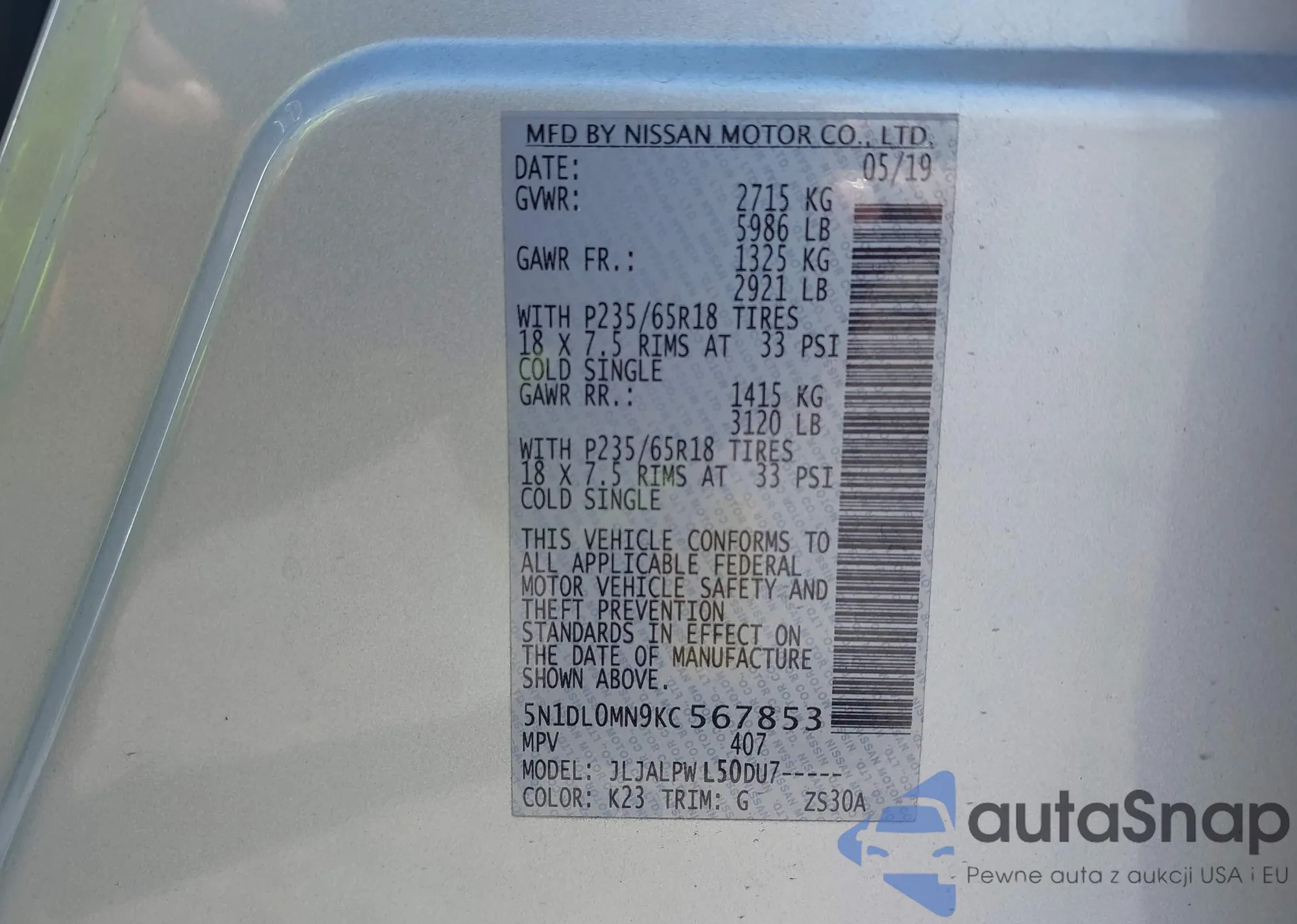 LOT: 42975322 VIN: 5N1DL0MM5KC563869