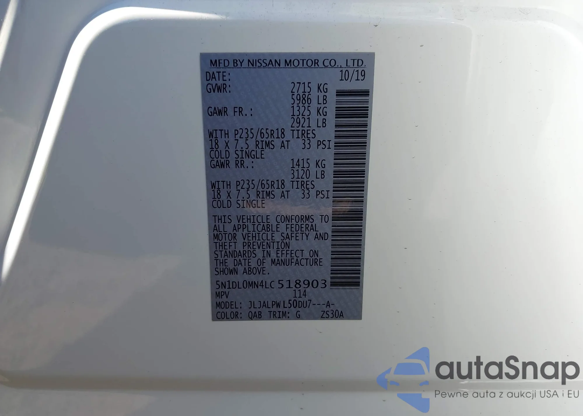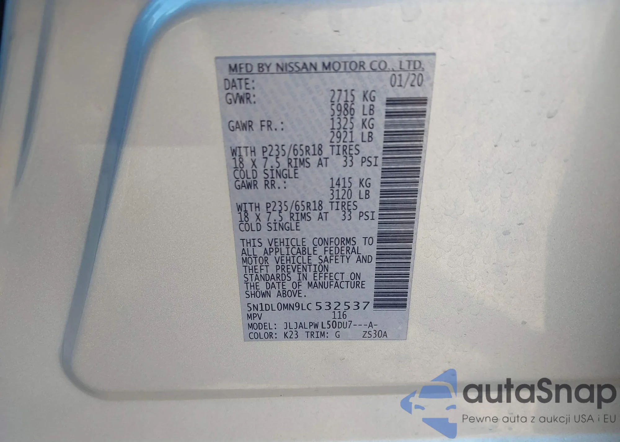 LOT: 43872428 VIN: 5N1DL0MN4LC518903