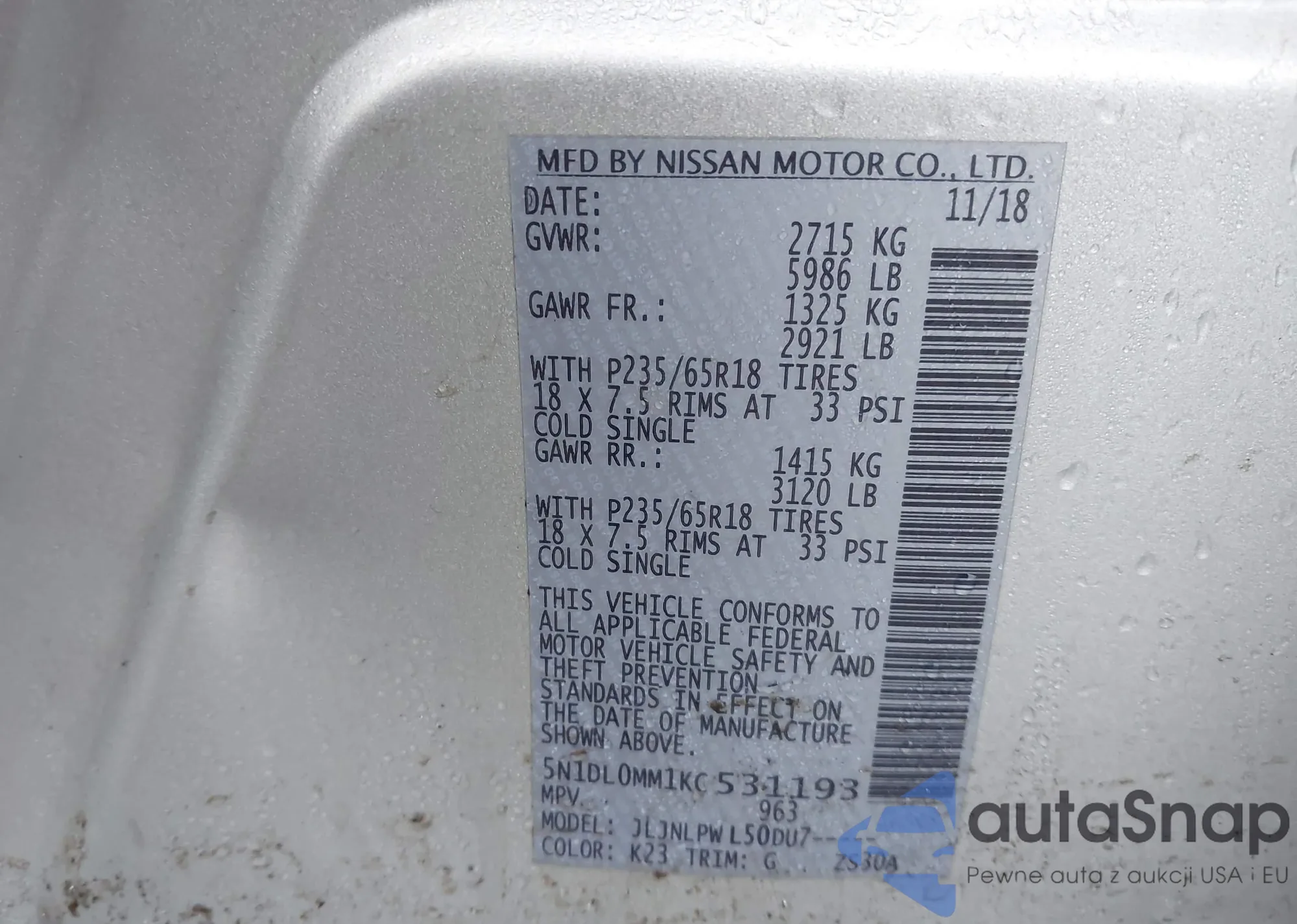 • VIN 5N1DL0MM1KC531193