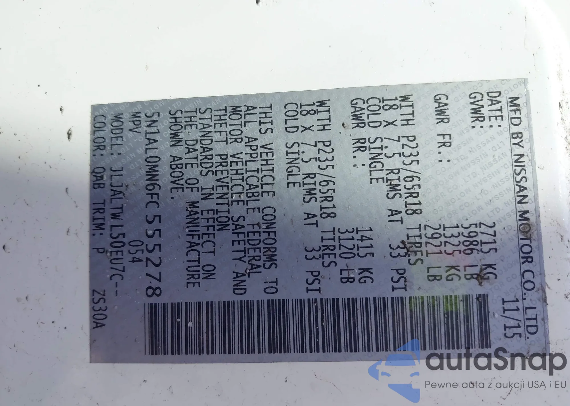 • VIN 5N1AL0MN6FC555278