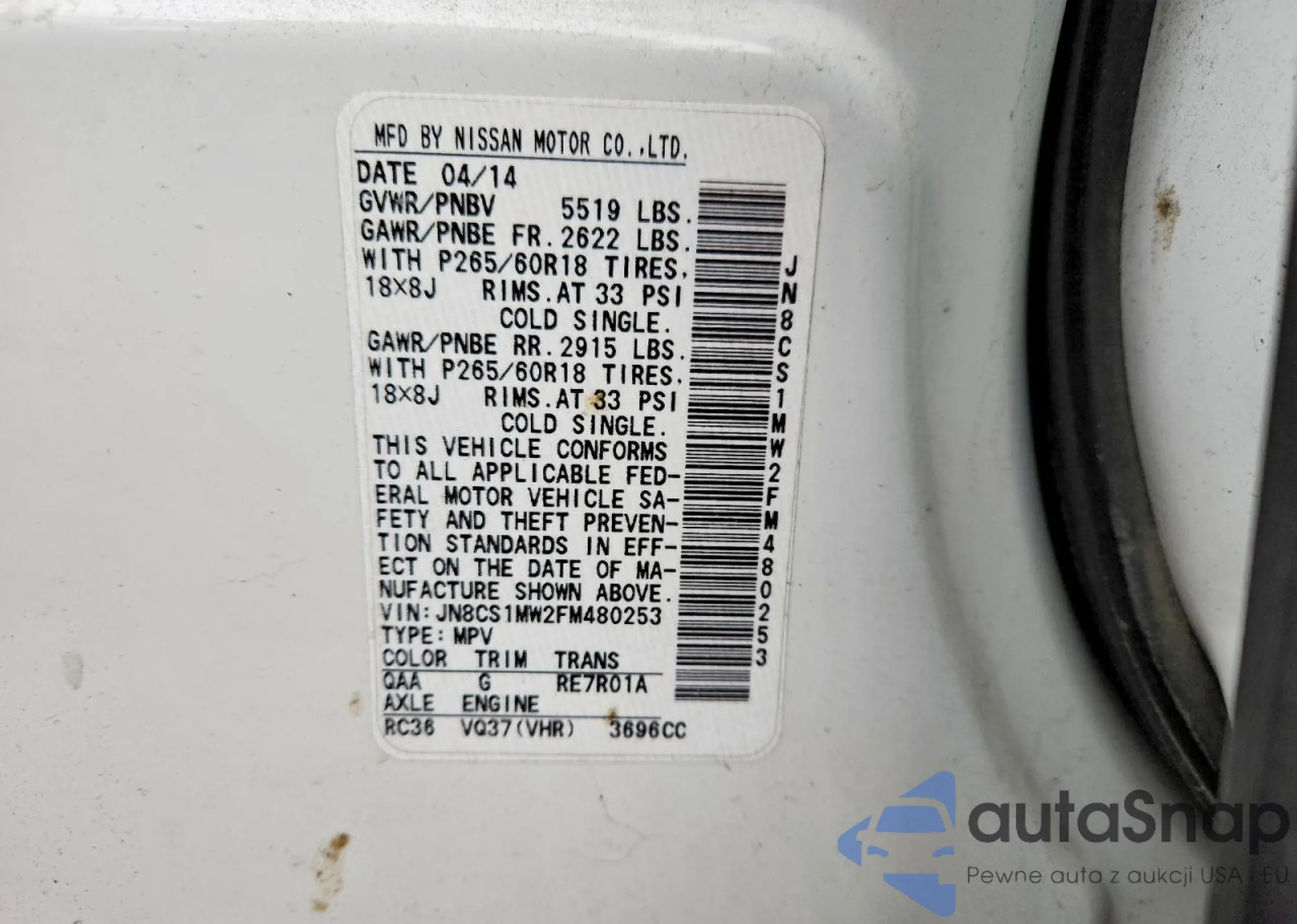 LOT: 44367586 VIN: JN8CS1MU0FM380683