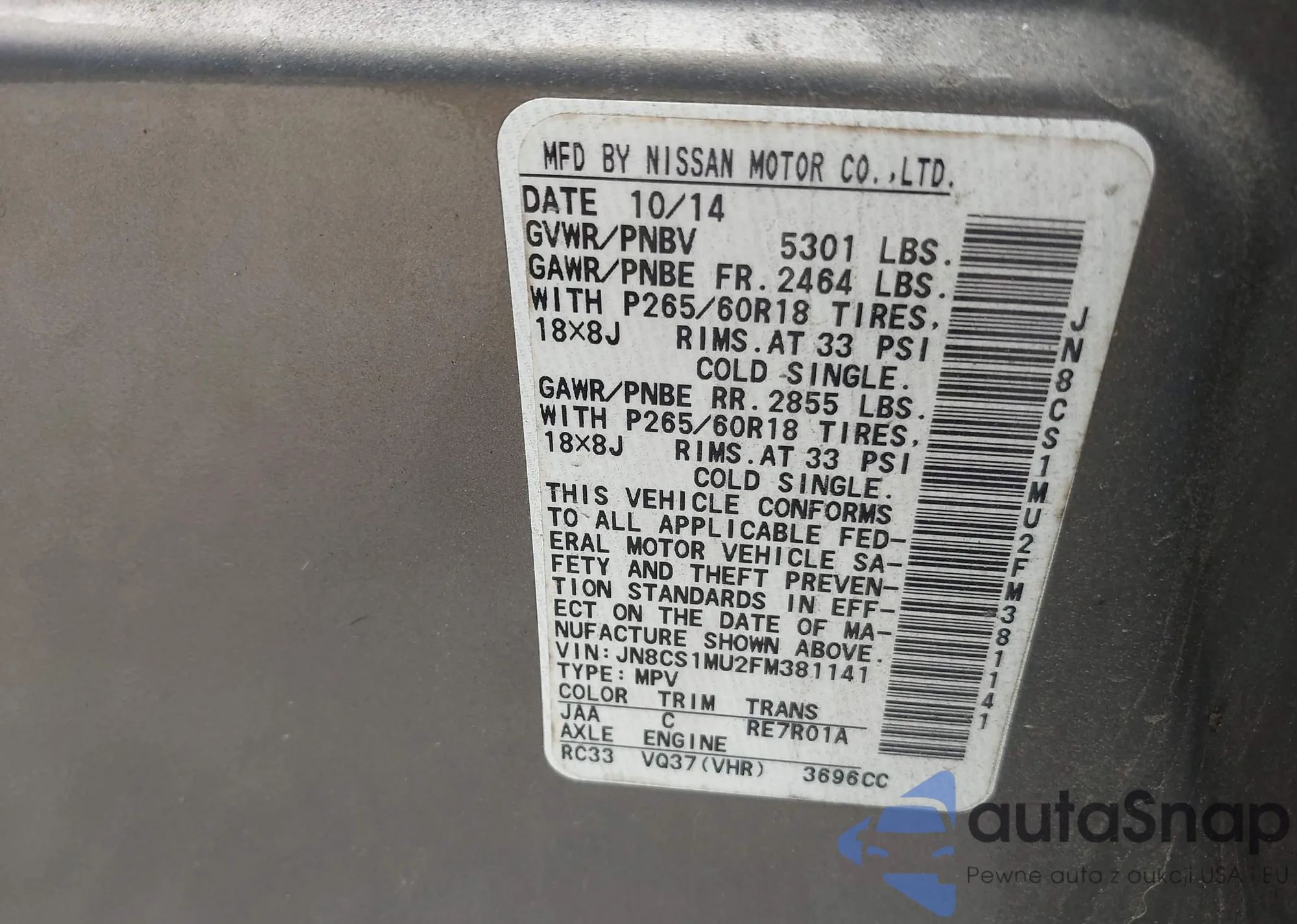 LOT: 44598010 VIN: JN8CS1MU2FM381141