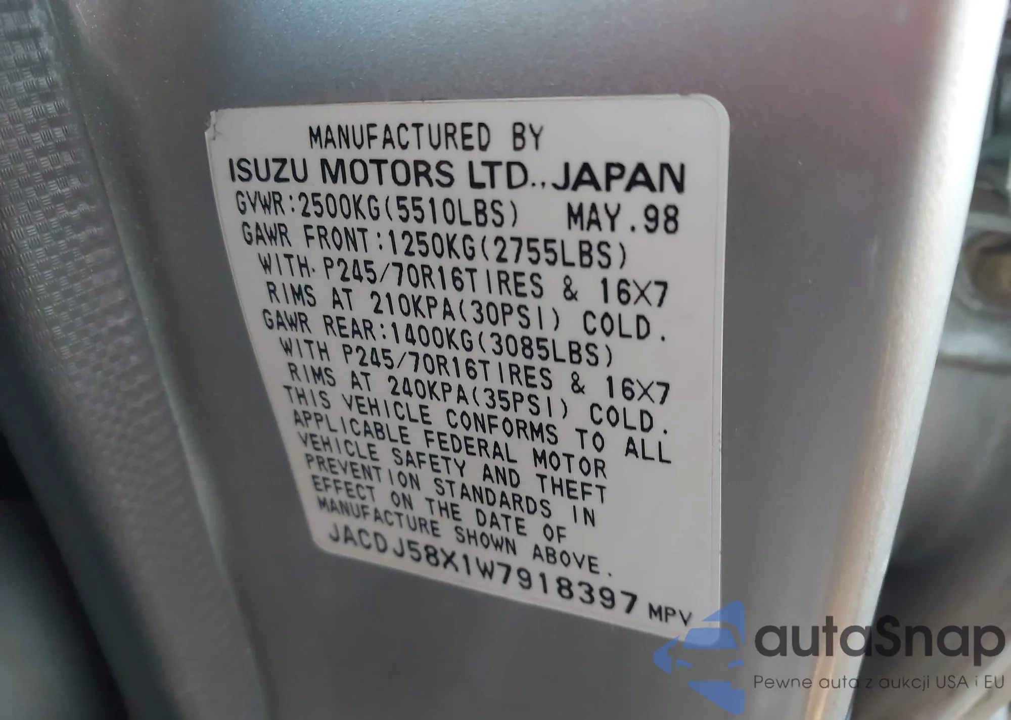 • VIN JACDJ58X1W7918397