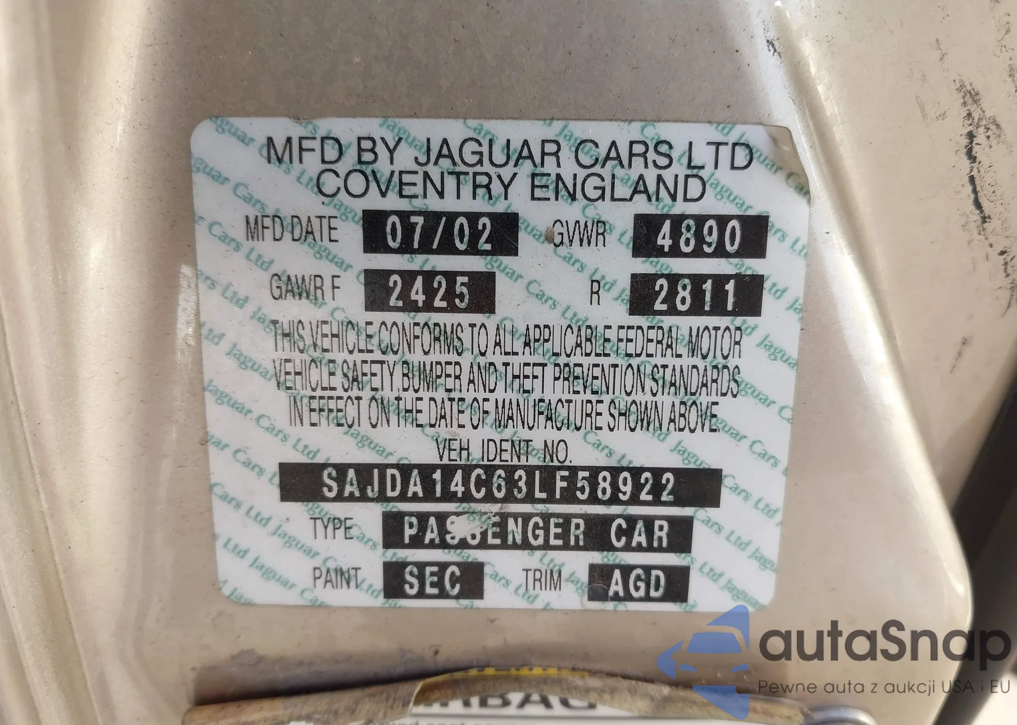 LOT: 44321302 VIN: SAJWJ1CD0G8V92072
