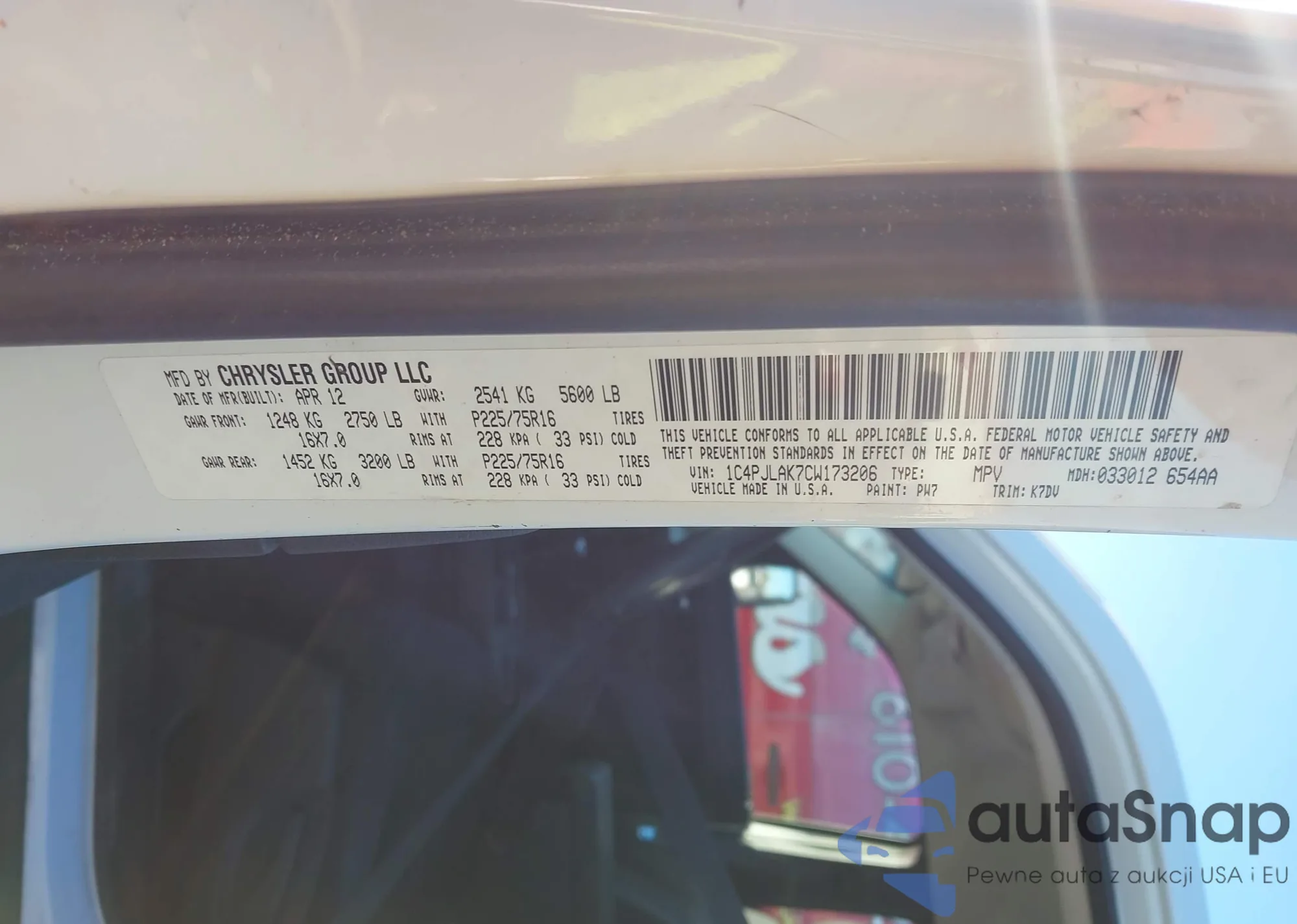 • VIN 1C4PJLAK7CW173206