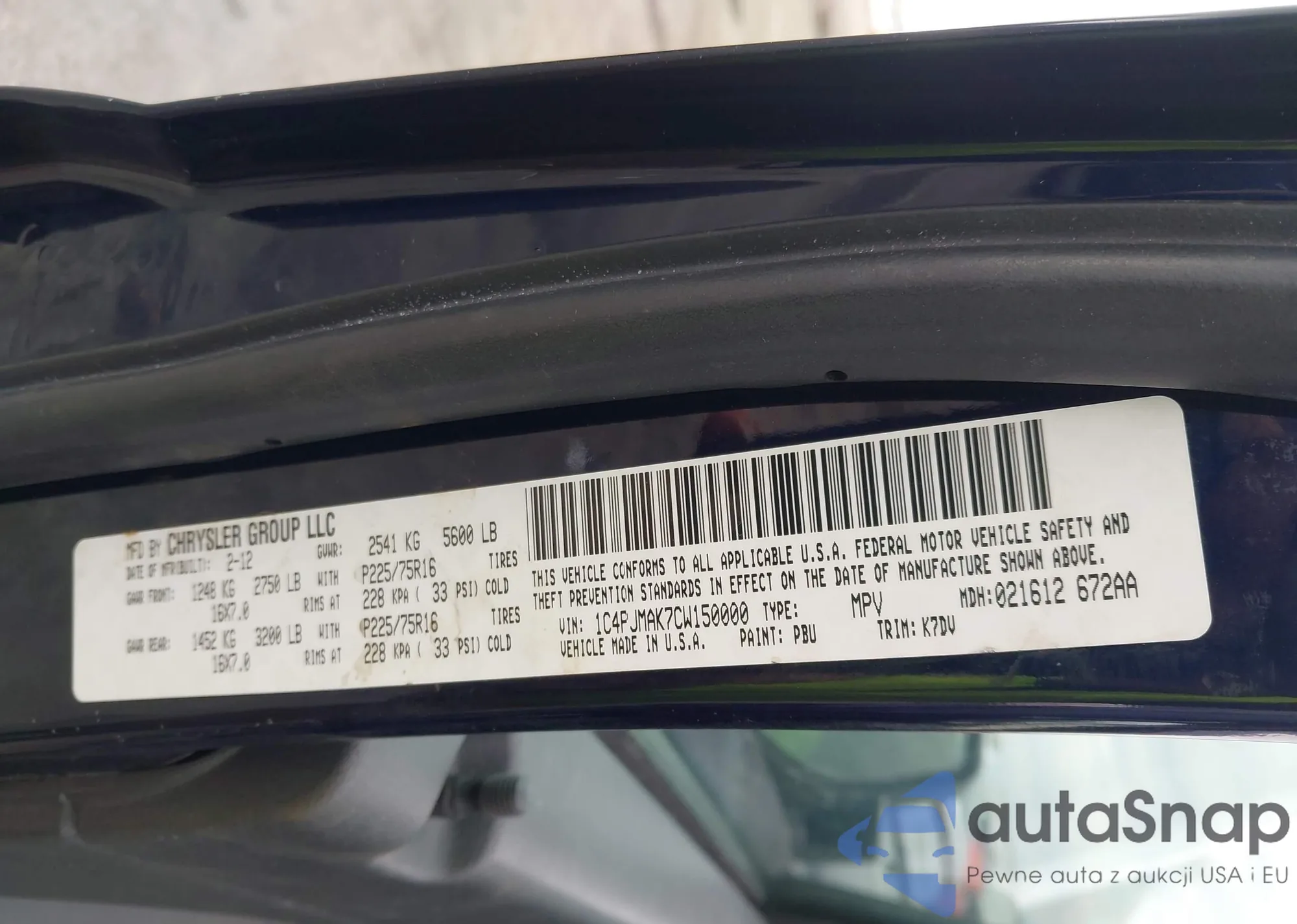 • VIN 1C4PJMAK7CW150000