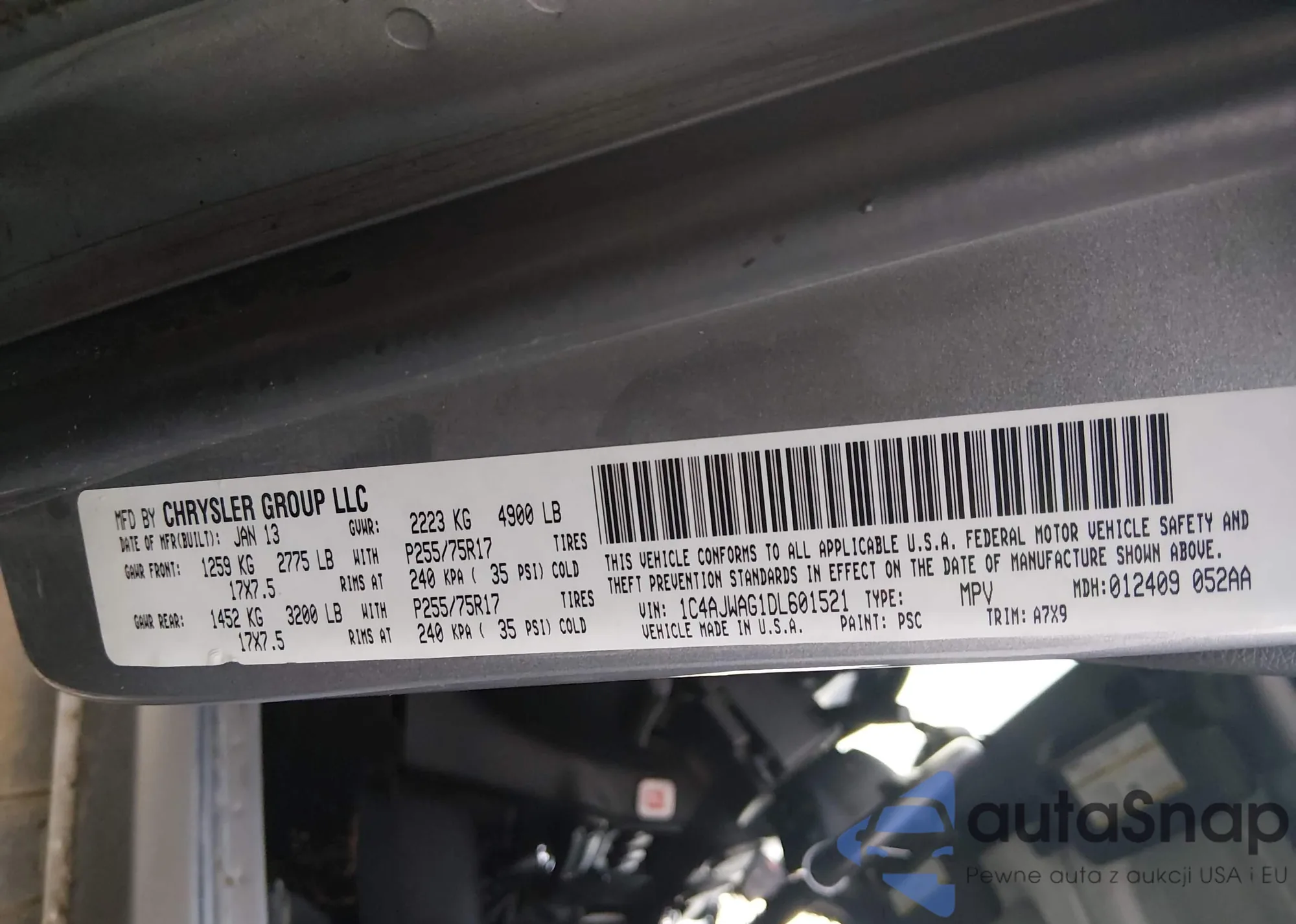 • VIN 1C4AJWAG1DL601521