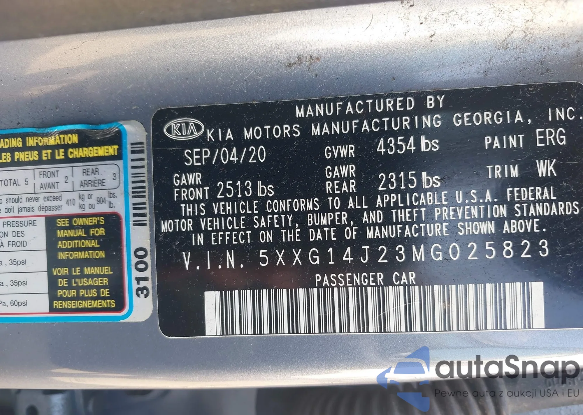 LOT: 42993381 VIN: 5XXG14J23MG025823