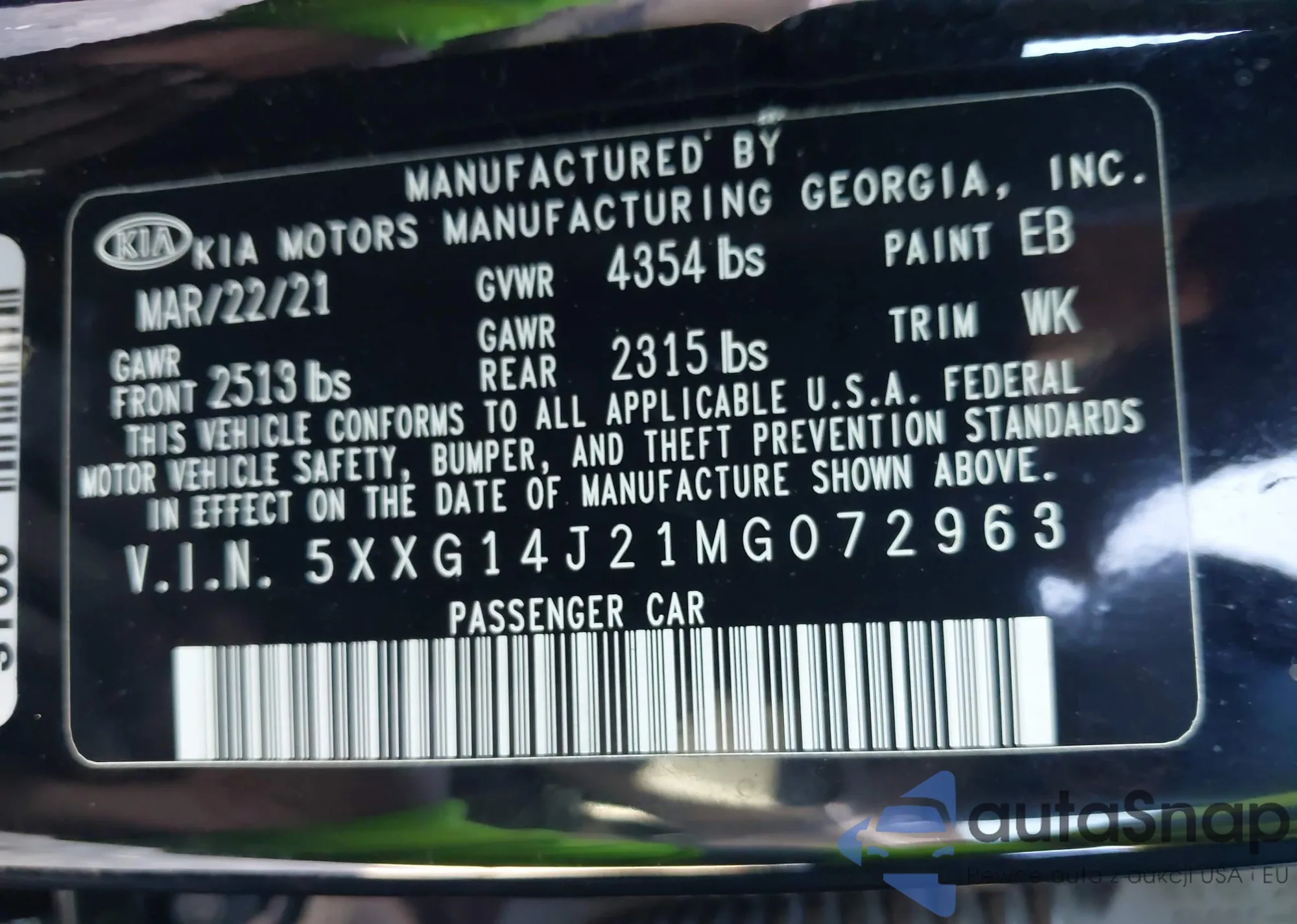 LOT: 43058562 VIN: 5XXG14J21MG072963
