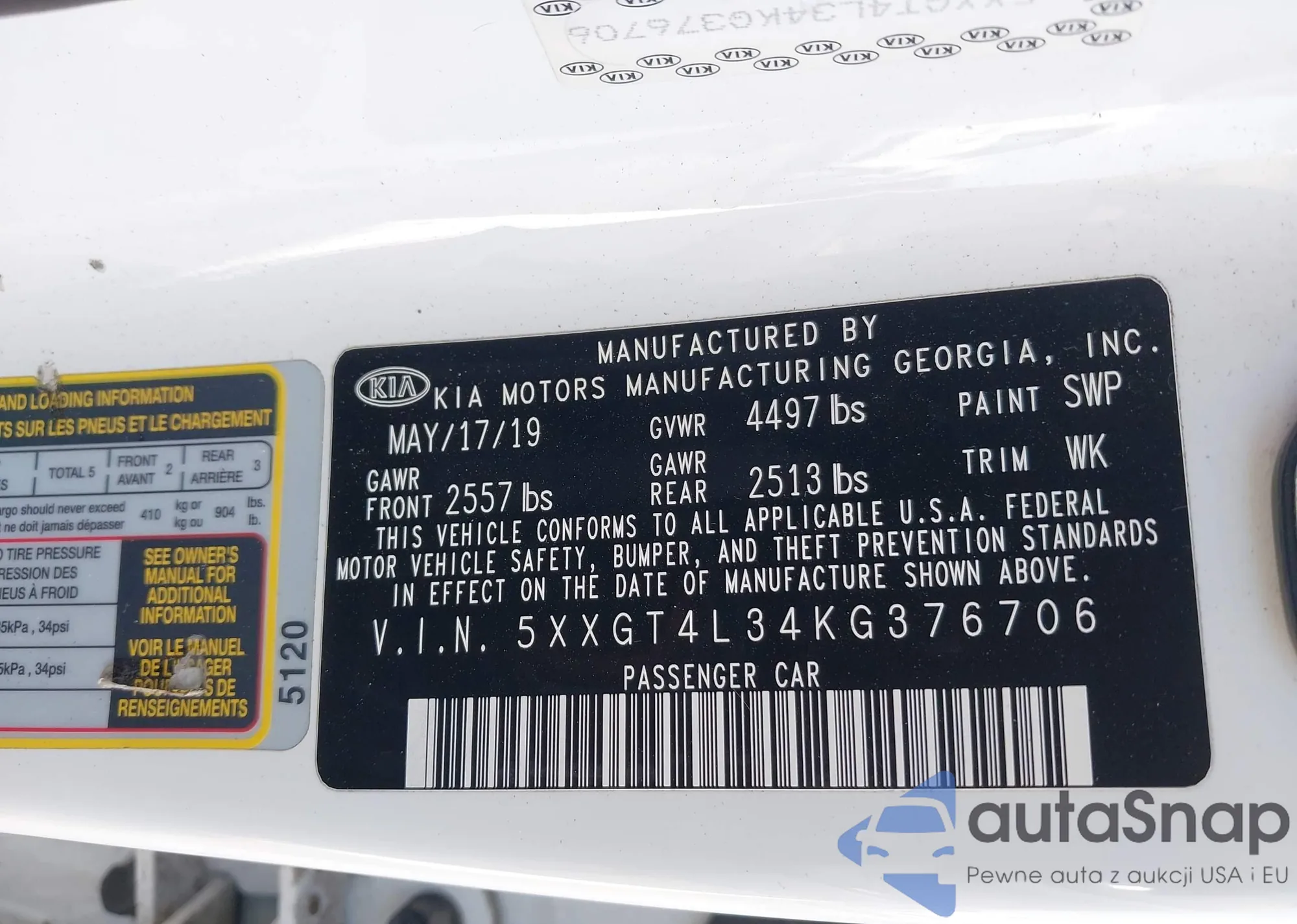 • VIN 5XXGT4L34KG376706