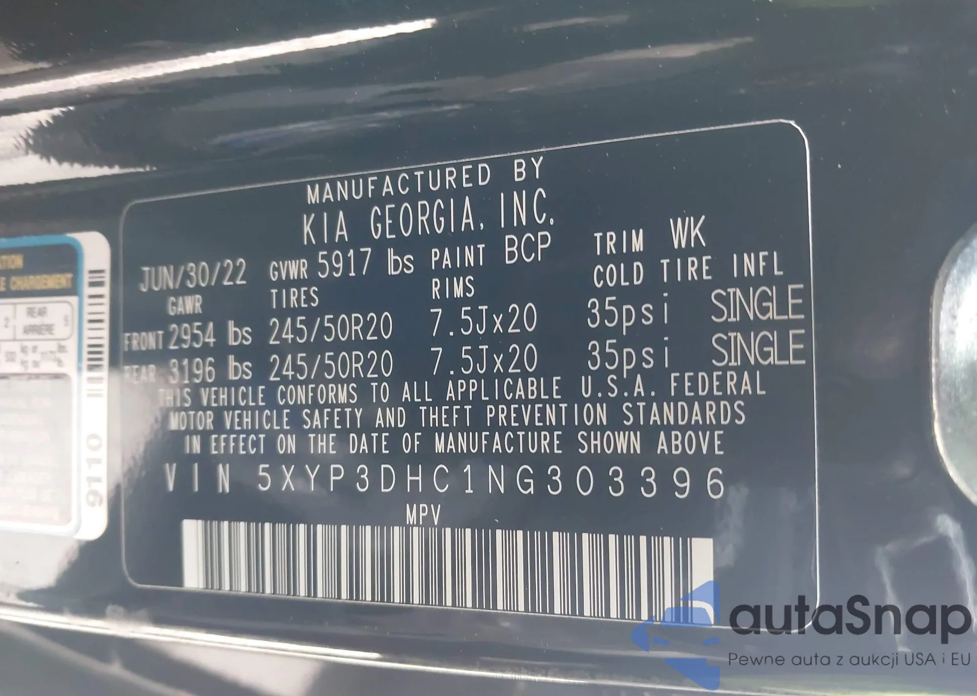 • VIN 5XYP3DHC1NG303396