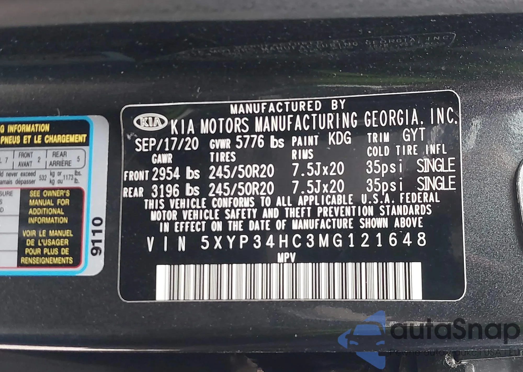 LOT: 44620996 VIN: 5XYP34HC3MG121648