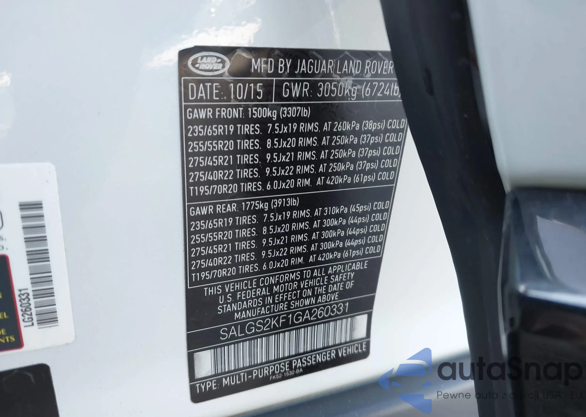 LOT: 44310784 VIN: SALGS2KF1GA260331