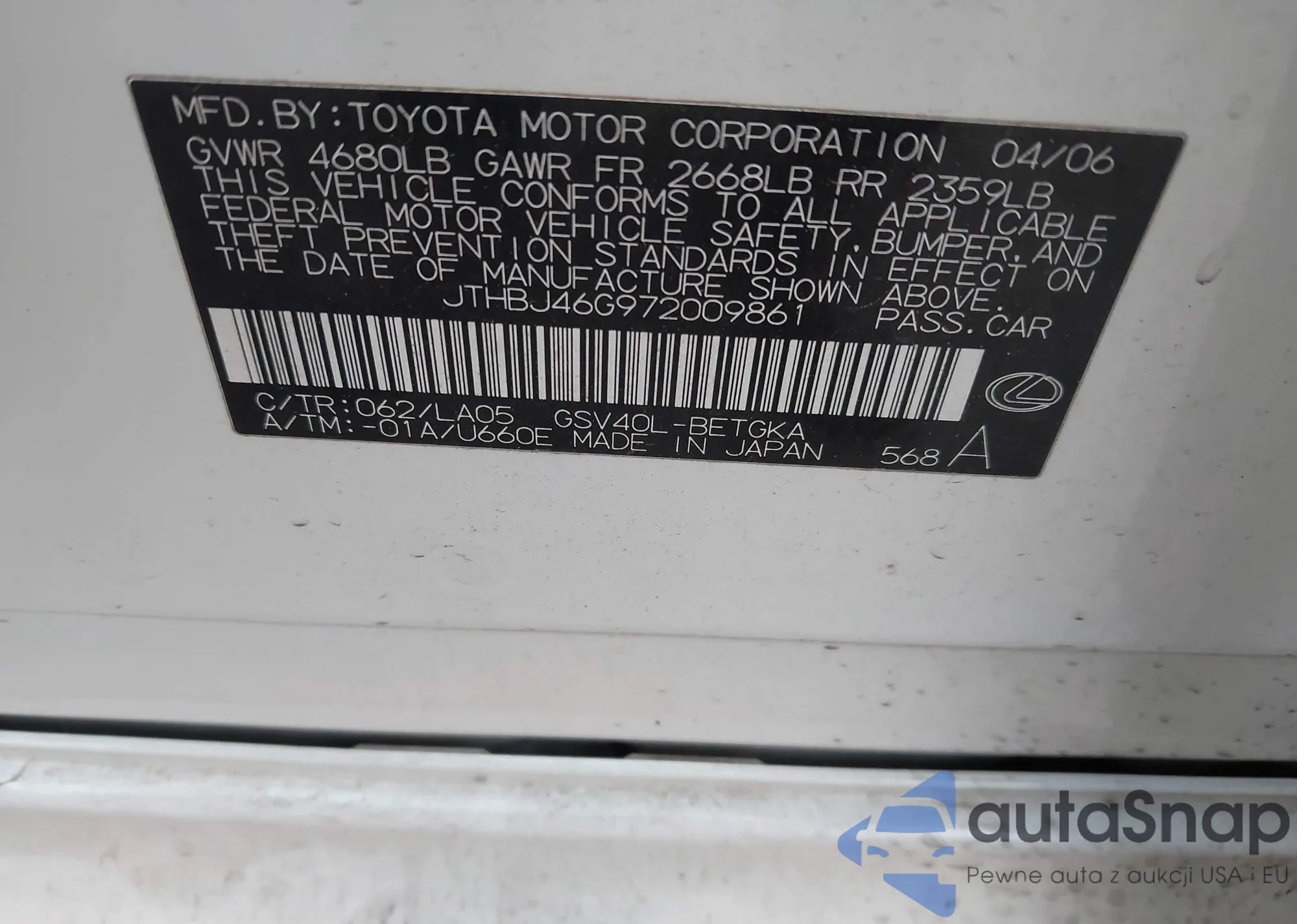 LOT: 44119418 VIN: JTHBJ46G972009861