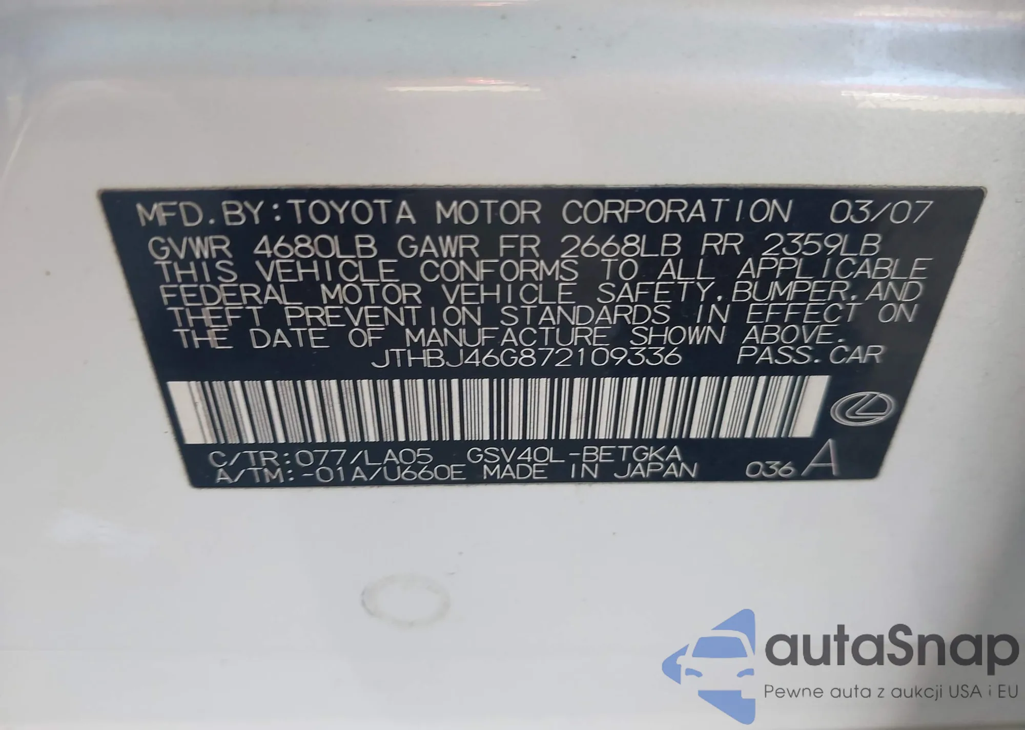 LOT: 44087071 VIN: JTHBJ46G072053098