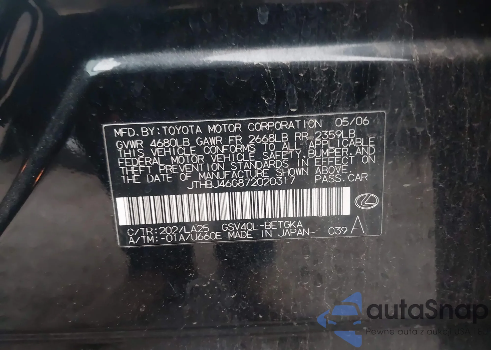 LOT: 43847450 VIN: JTHBJ46G872020317