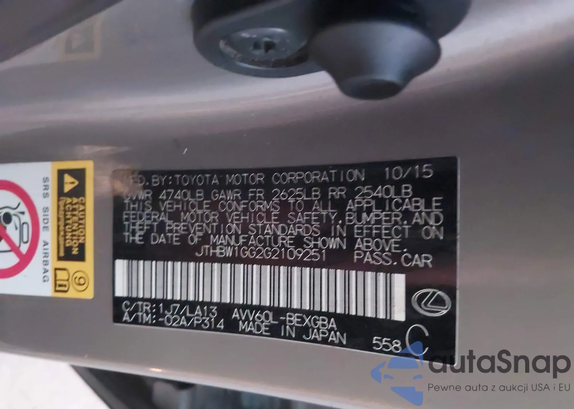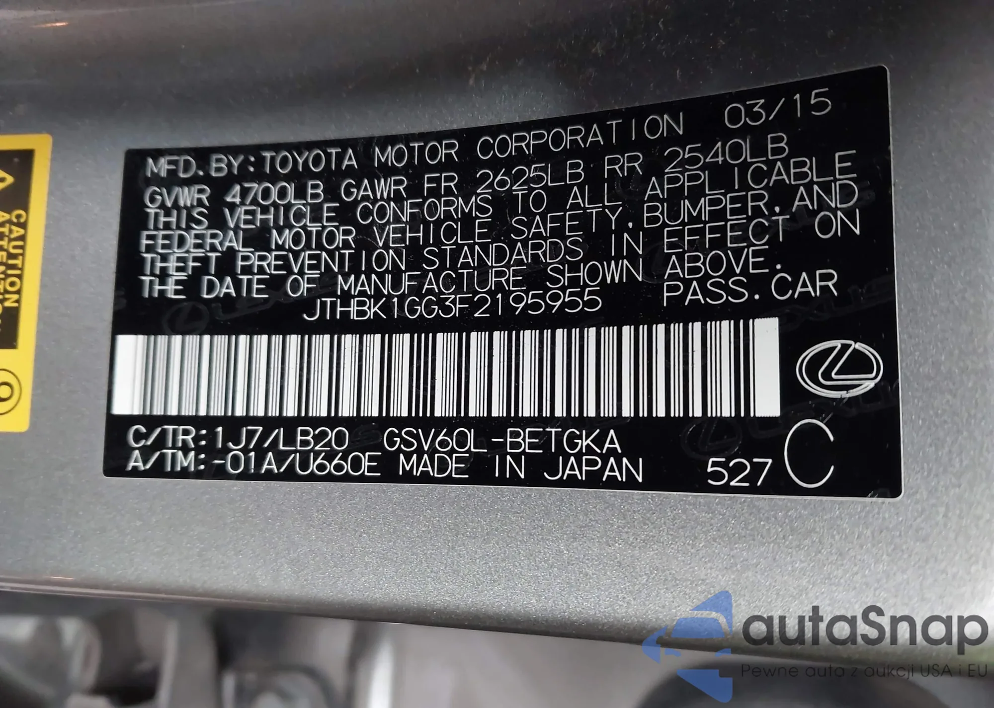 LOT: 43844229 VIN: JTHBW1GGXF2082850