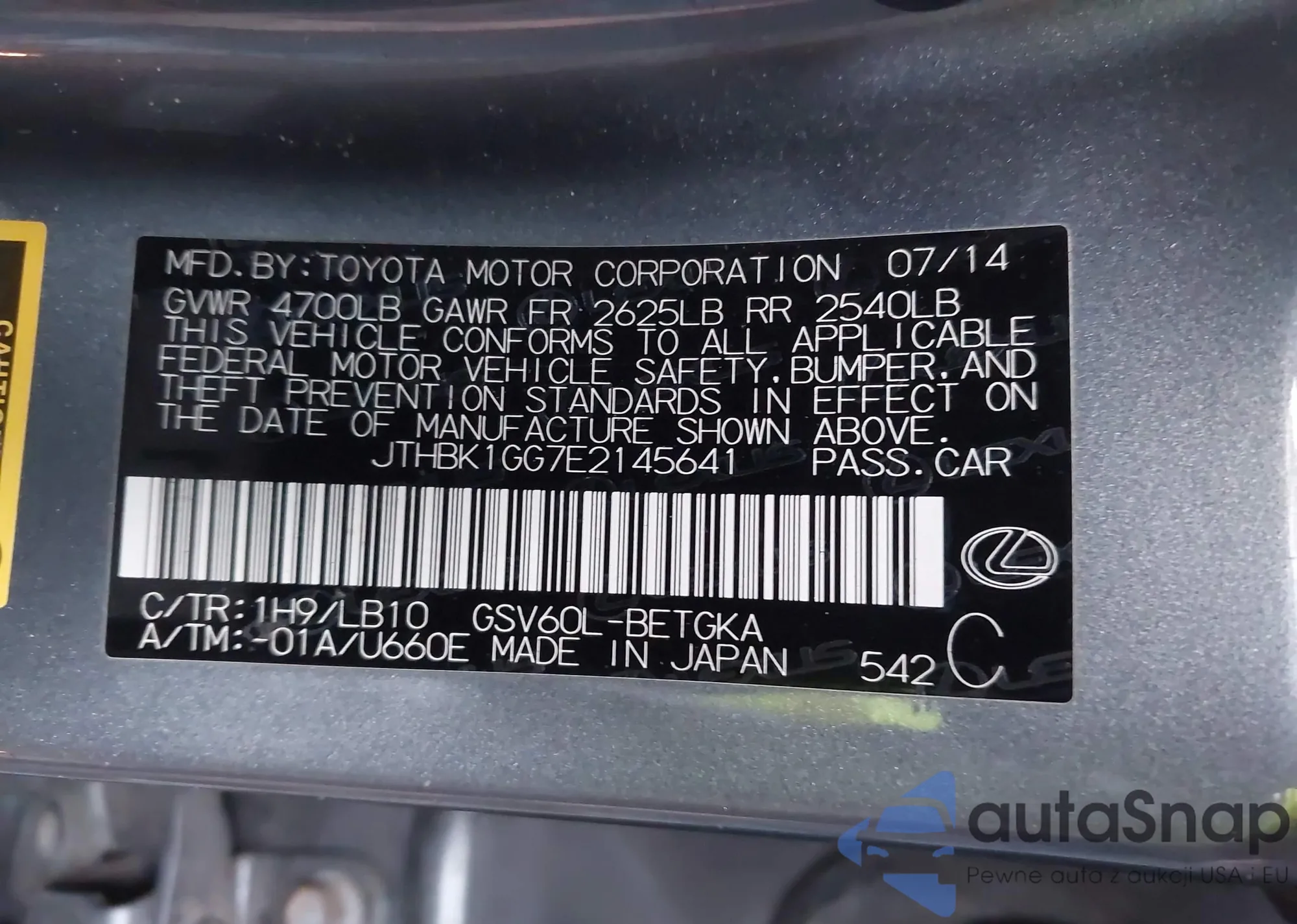 • VIN JTHBK1GG7E2145641