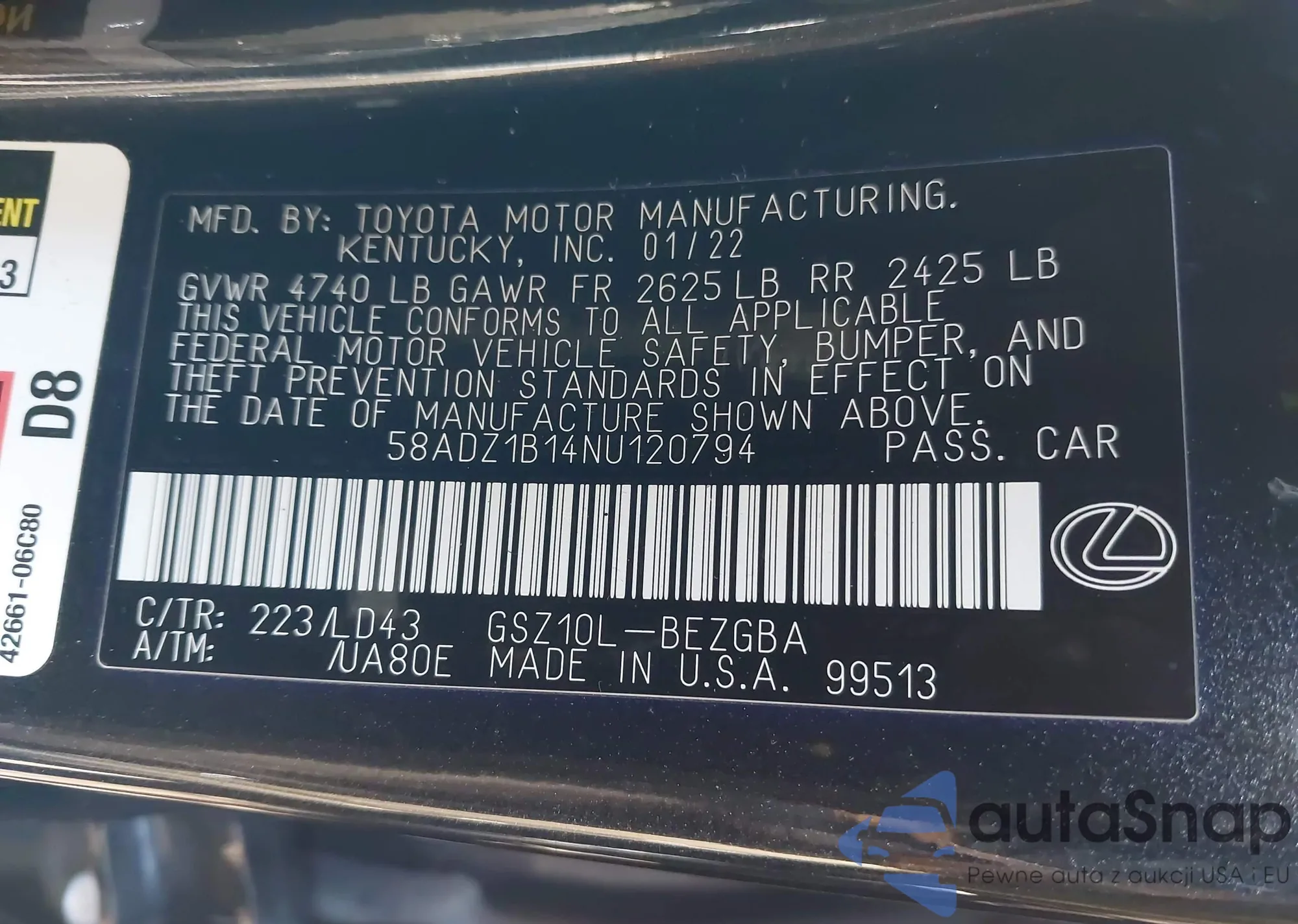 LOT: 44280195 VIN: 58ADZ1B14NU120794