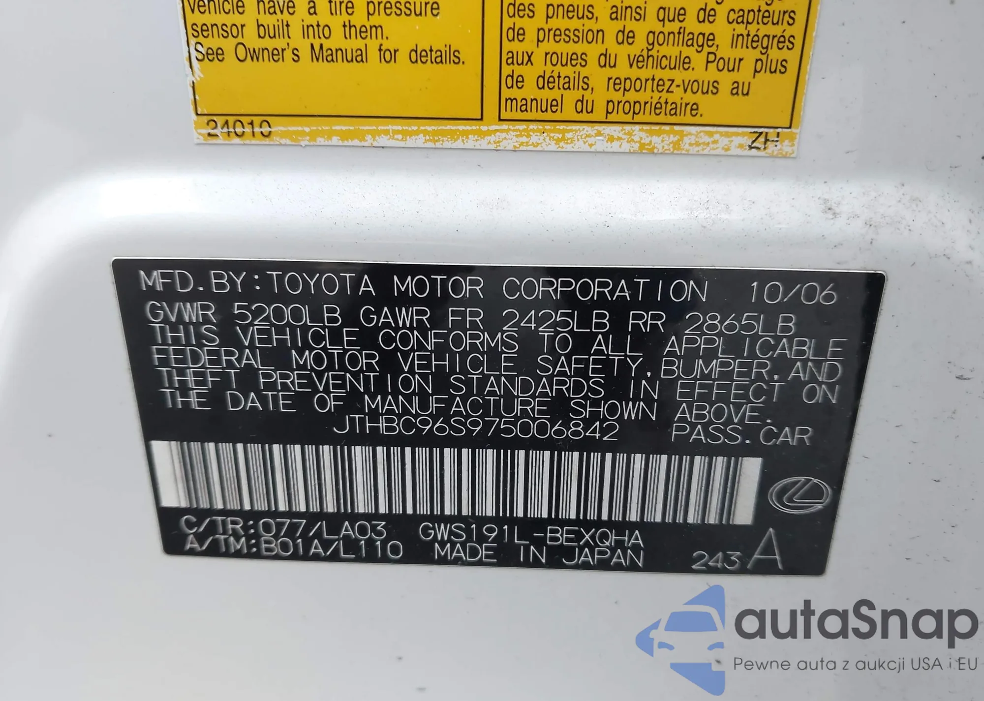 LOT: 97502845 VIN: JTHBE96SX70015010