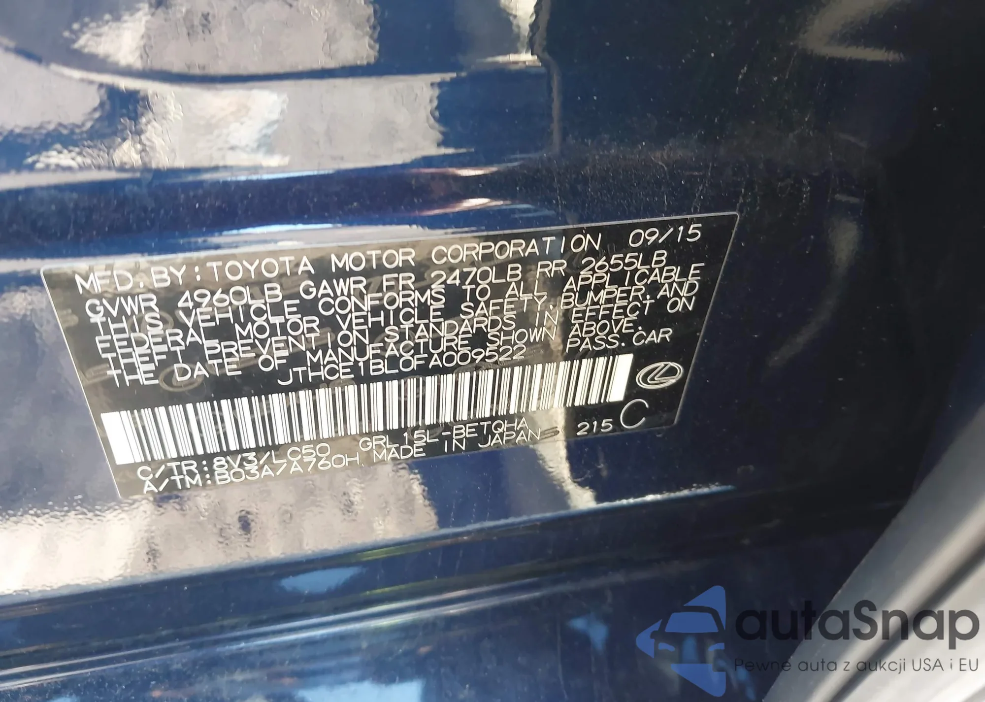 • VIN JTHCE1BL0FA009522