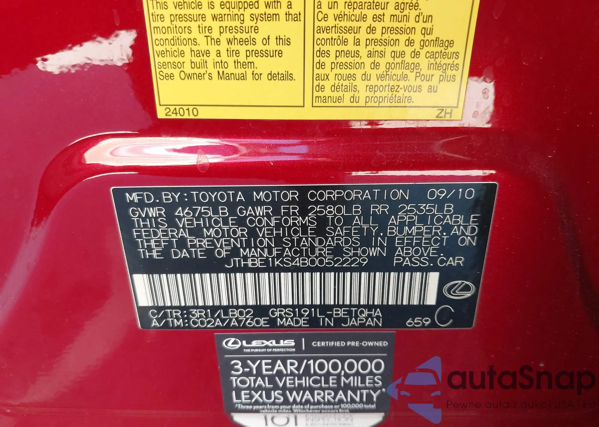 LOT: 44320465 VIN: JTHBE1KS4B0052229