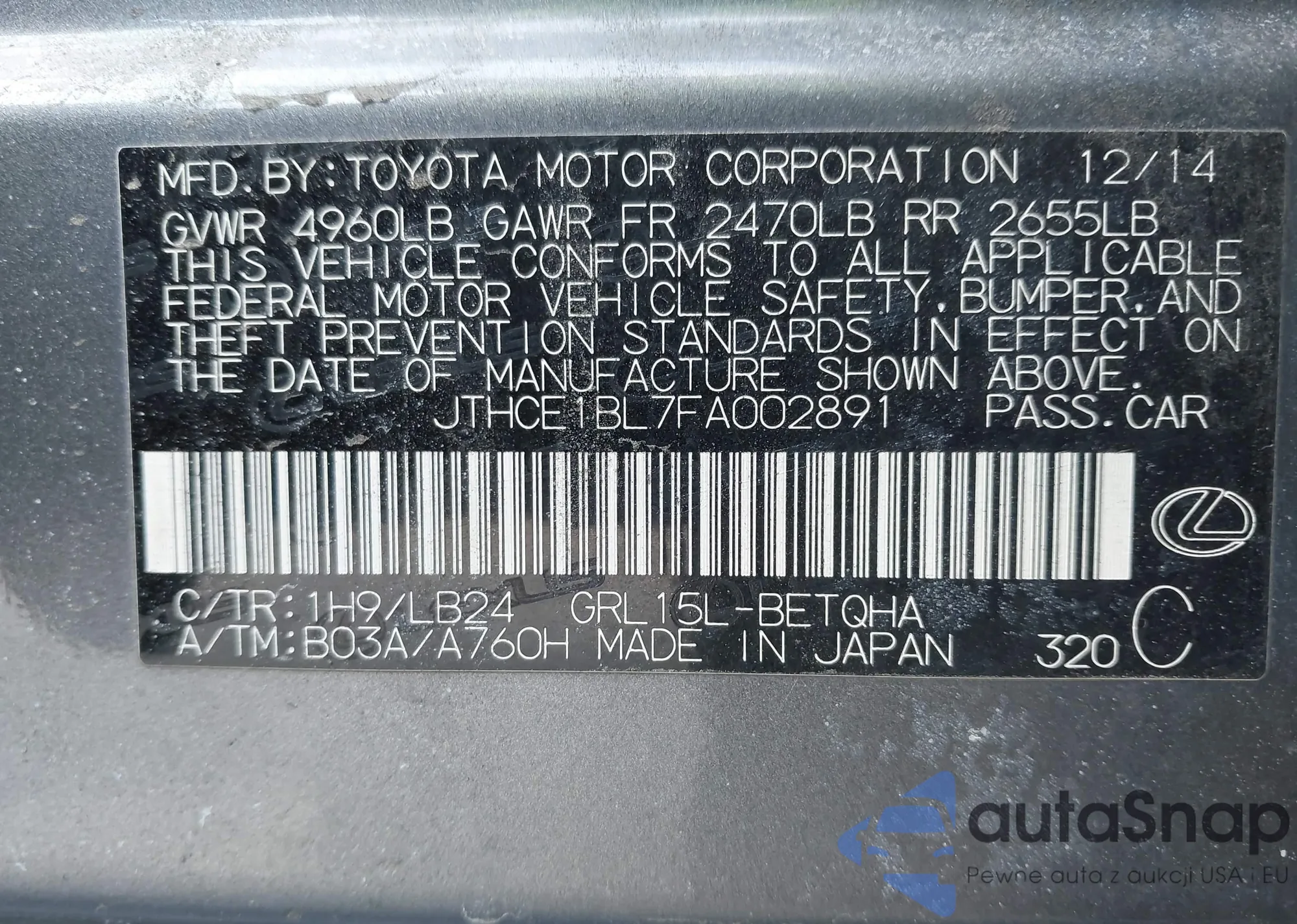 • VIN JTHCE1BL7FA002891